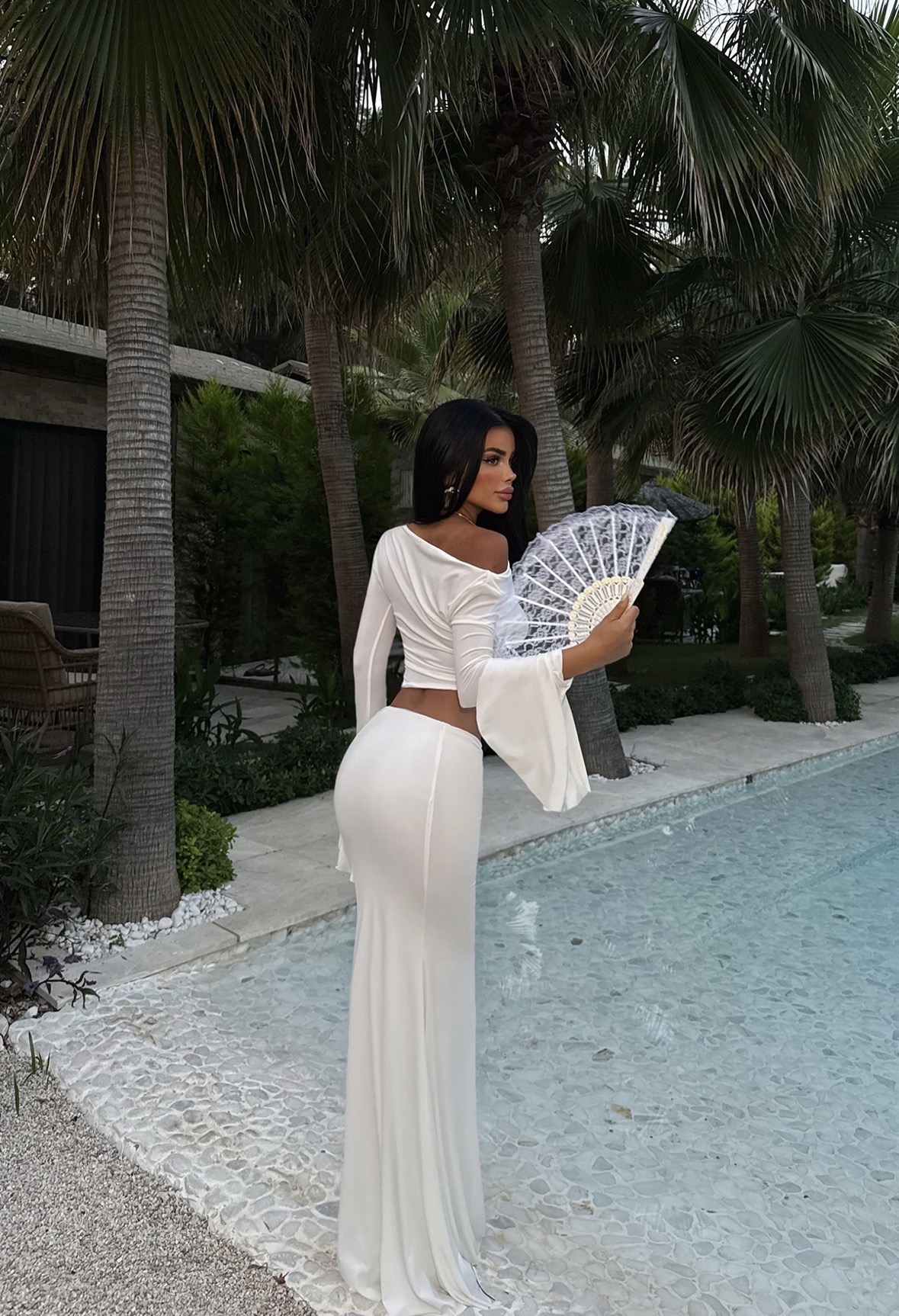 Biały komplet spódnica maxi i asymetryczny top | Bali Set | elegancki zestaw na wesele i wakacje
