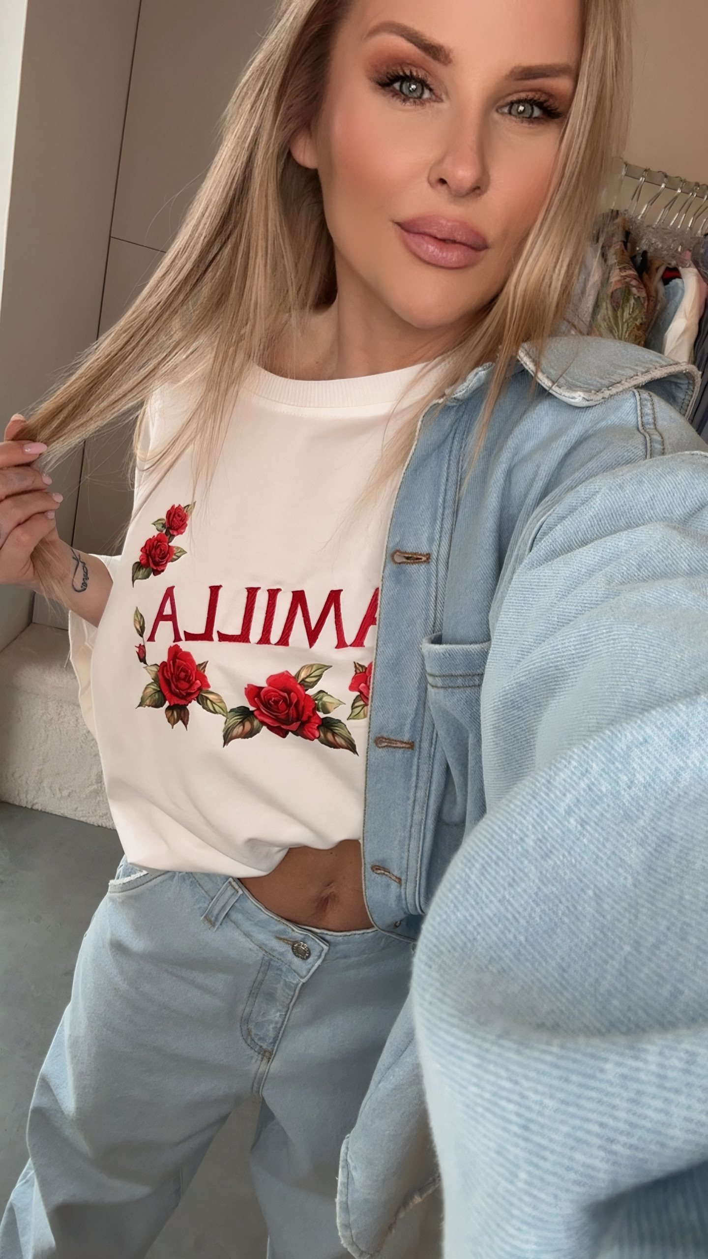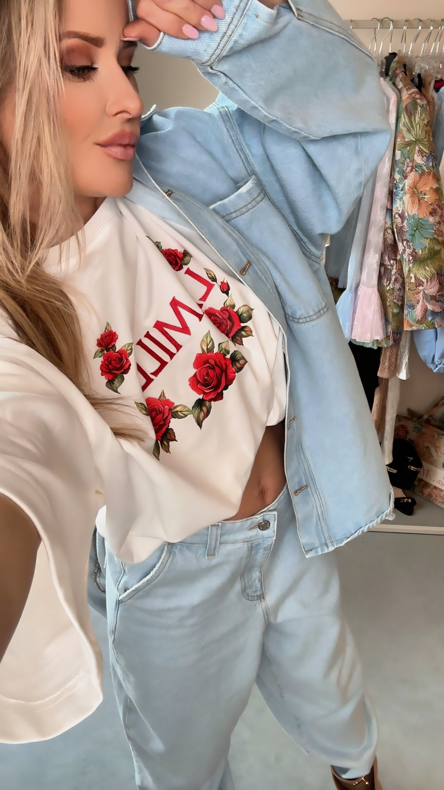 T-shirt doskonale komponuje się z klasycznymi jeansami z wysokim stanem, tworząc niezobowiązujący, codzienny look. W wersji bardziej eleganckiej możesz zestawić go z marynarką oversize i cygaretkami – kwiatowy motyw przełamie formalny charakter stroju, dodając mu kobiecości.