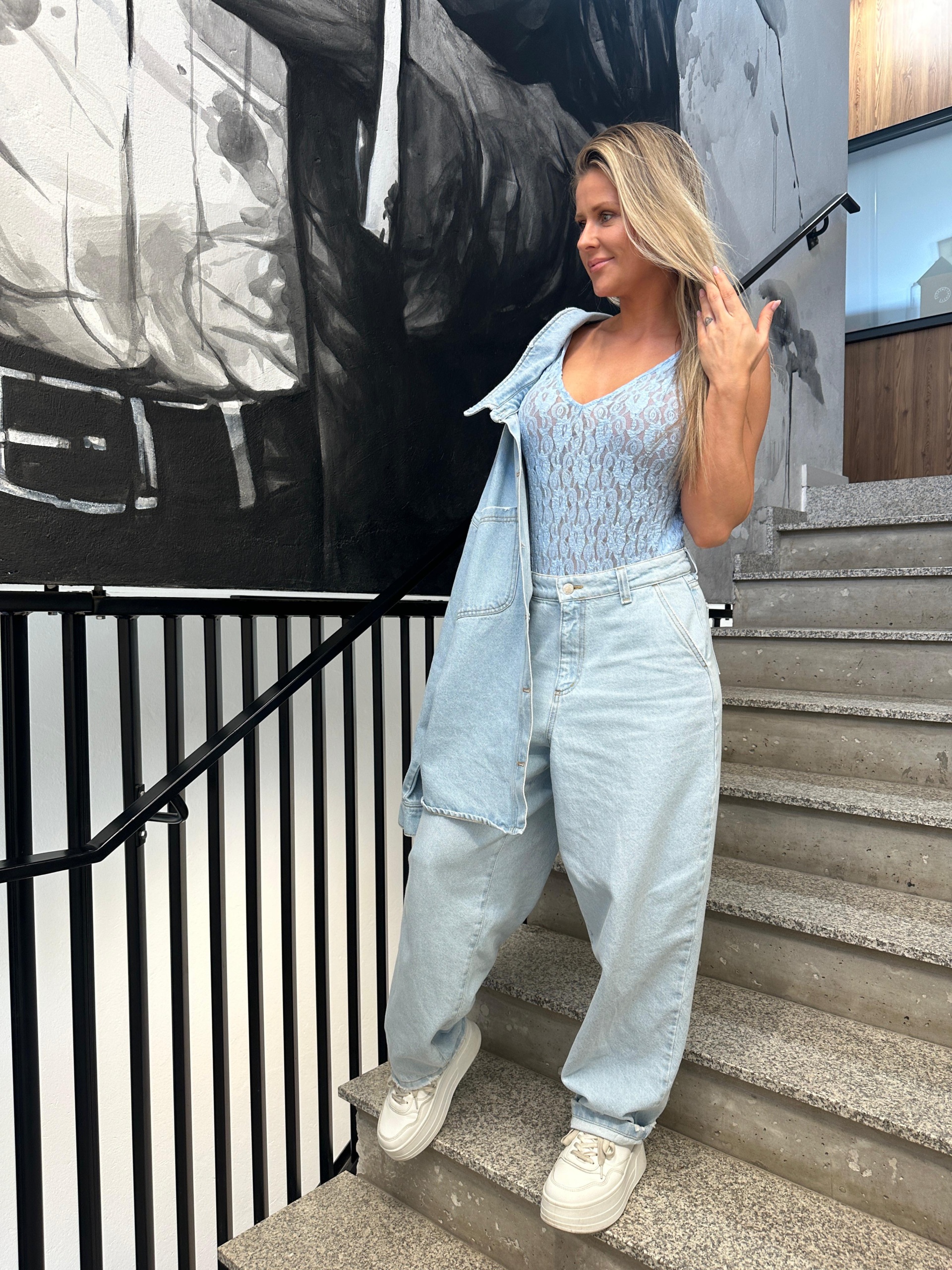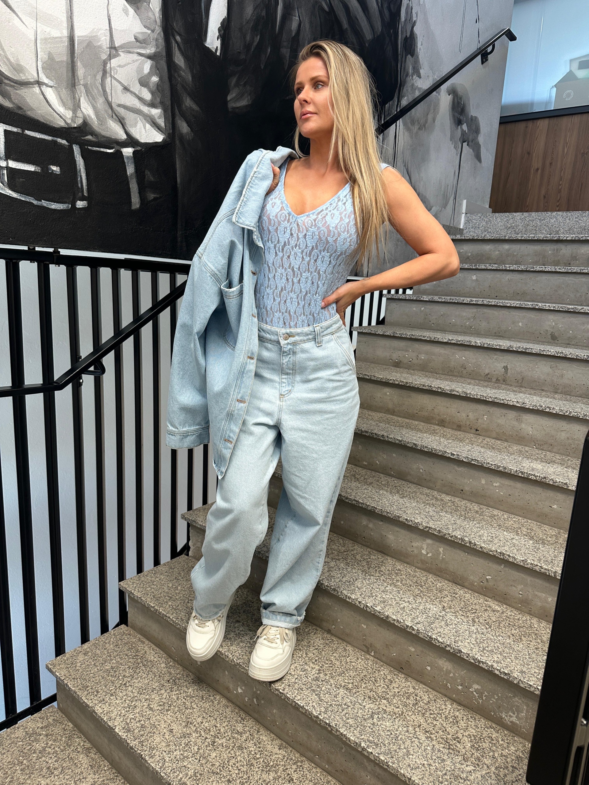 Błękitne body koronkowe z dekoltem V – eleganckie body pod marynarkę