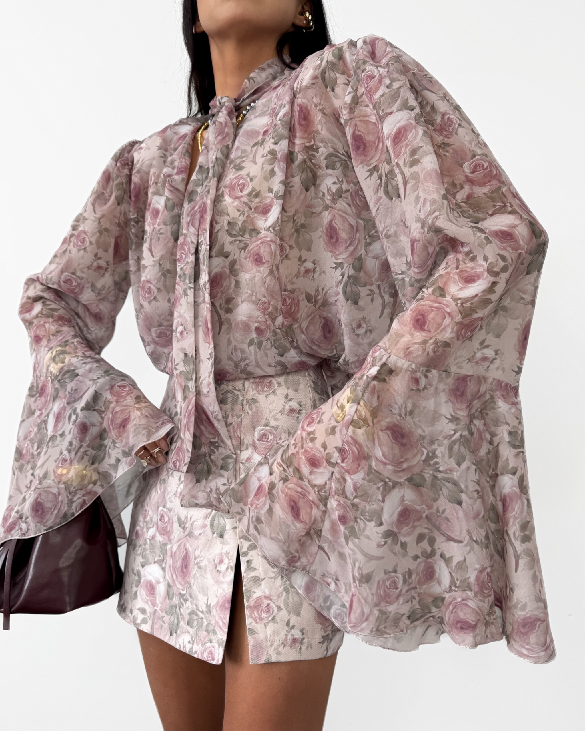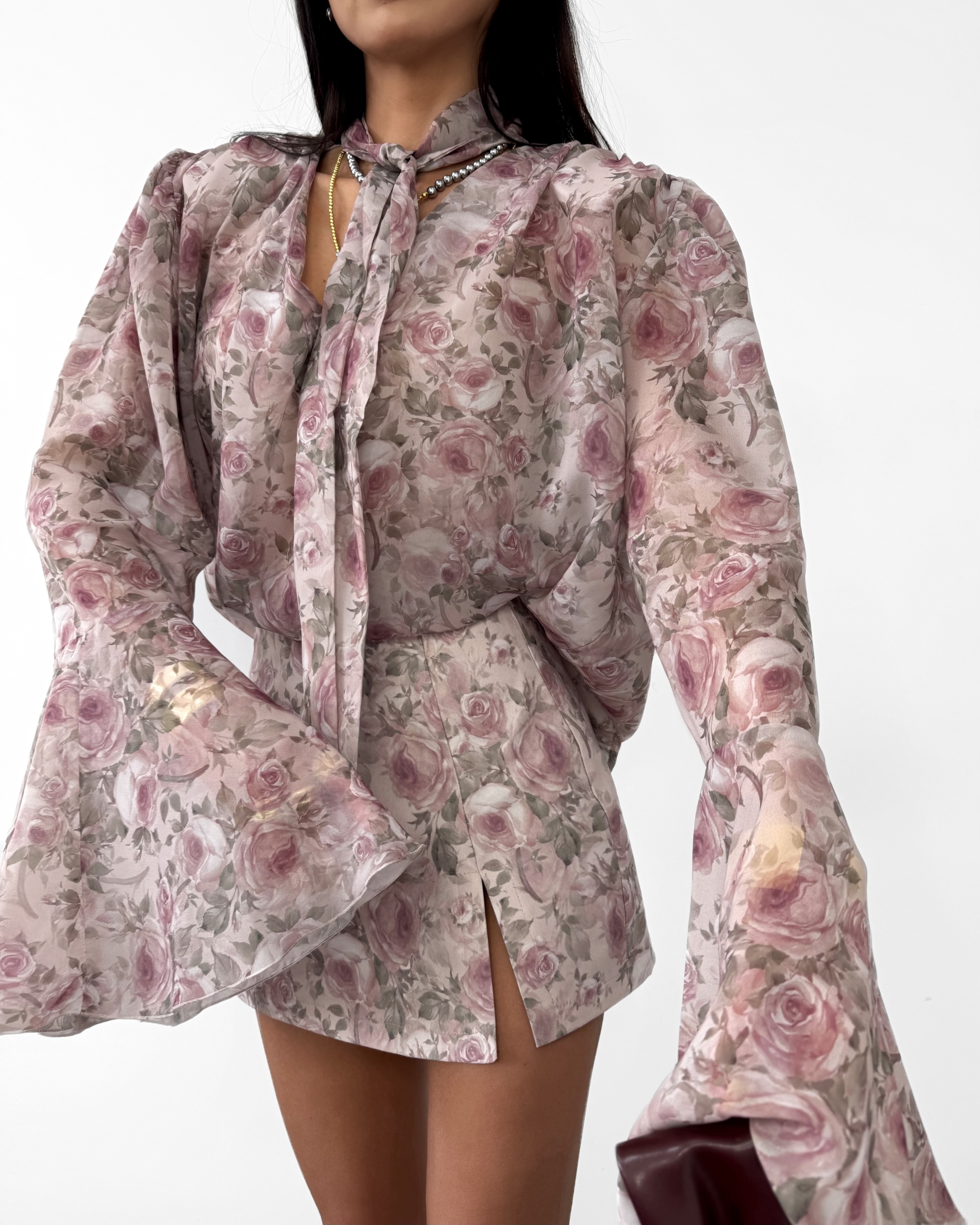 Bluzka szeroki rękaw zwiewna w kwiaty La Milla- beżowo różowa