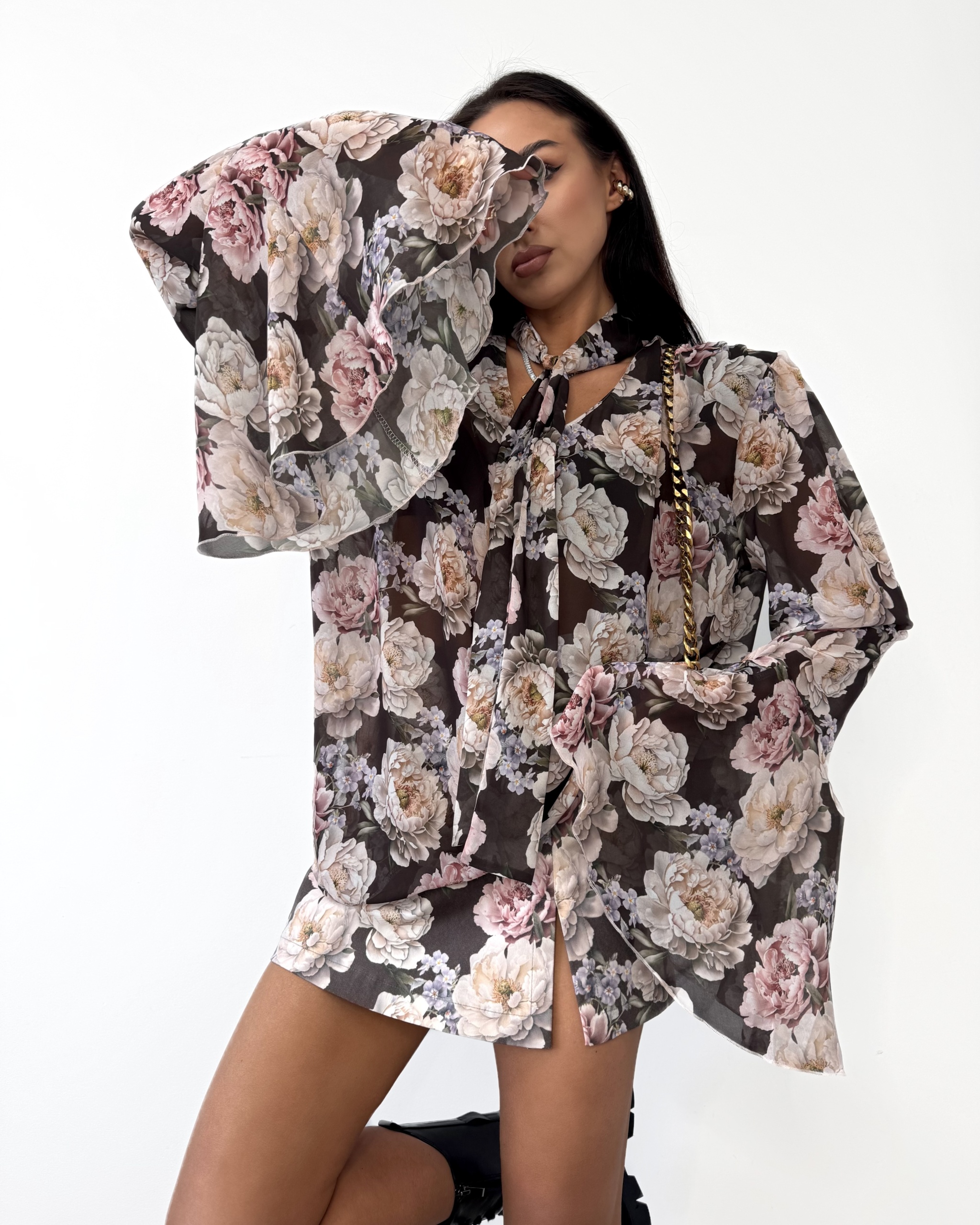 Bluzka szeroki rękaw zwiewna w kwiaty La Milla- brązowo beżowa