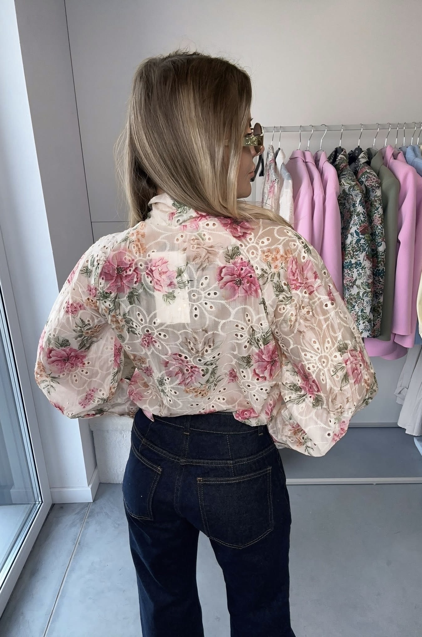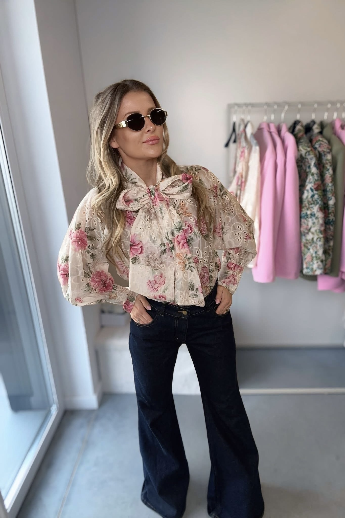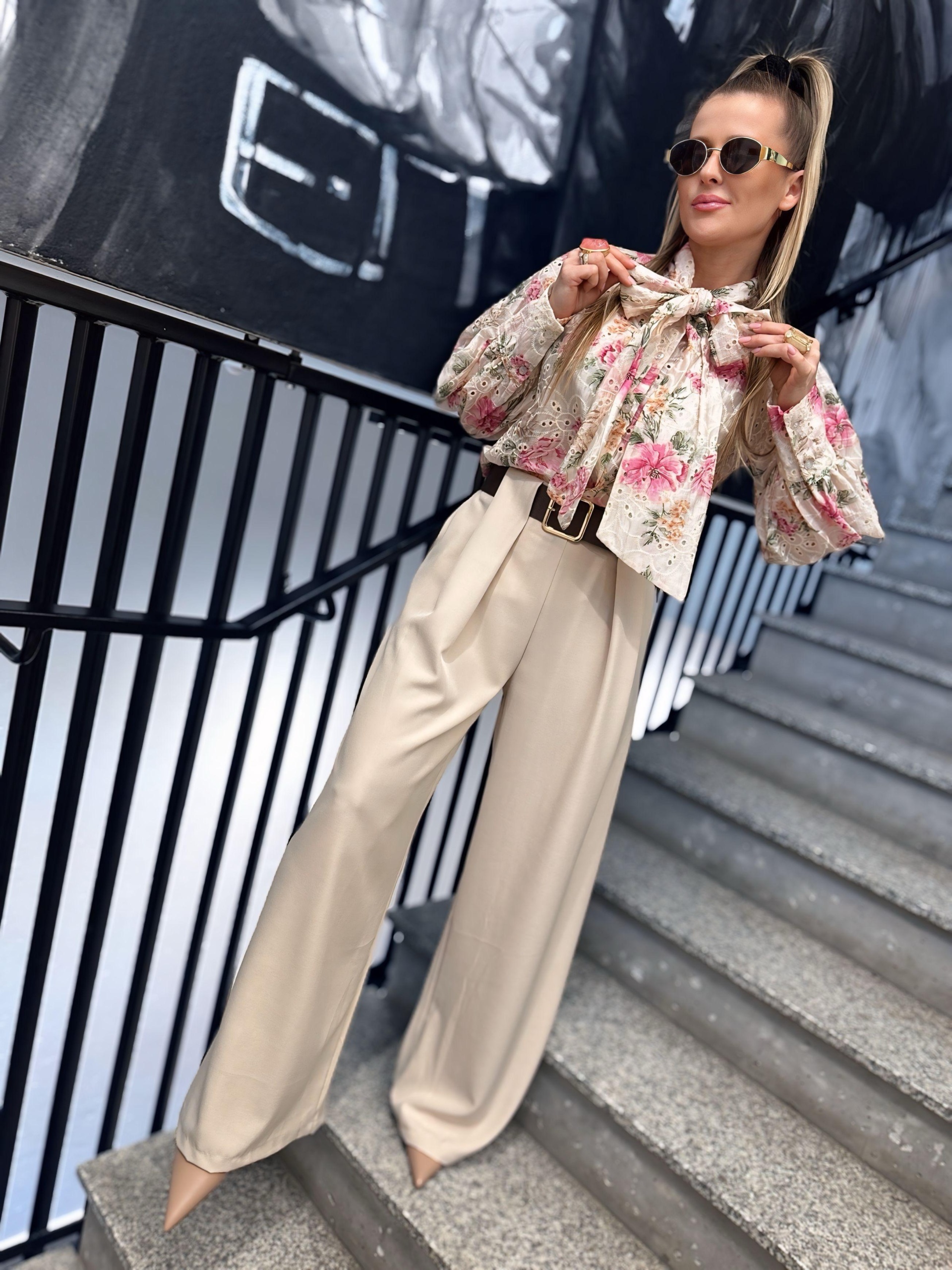 Koszula ażurowa z kokardą Rossa to niezwykle kobiecy model inspirowany włoskim stylem i subtelną elegancją. Delikatny, kwiatowy print w odcieniach różu i beżu w połączeniu z ozdobnym haftem nadaje jej wyjątkowego, romantycznego charakteru. Najbardziej przyciągającym uwagę elementem jest efektowna wiązana kokarda przy szyi, która pięknie podkreśla stylizację i dodaje jej szyku.