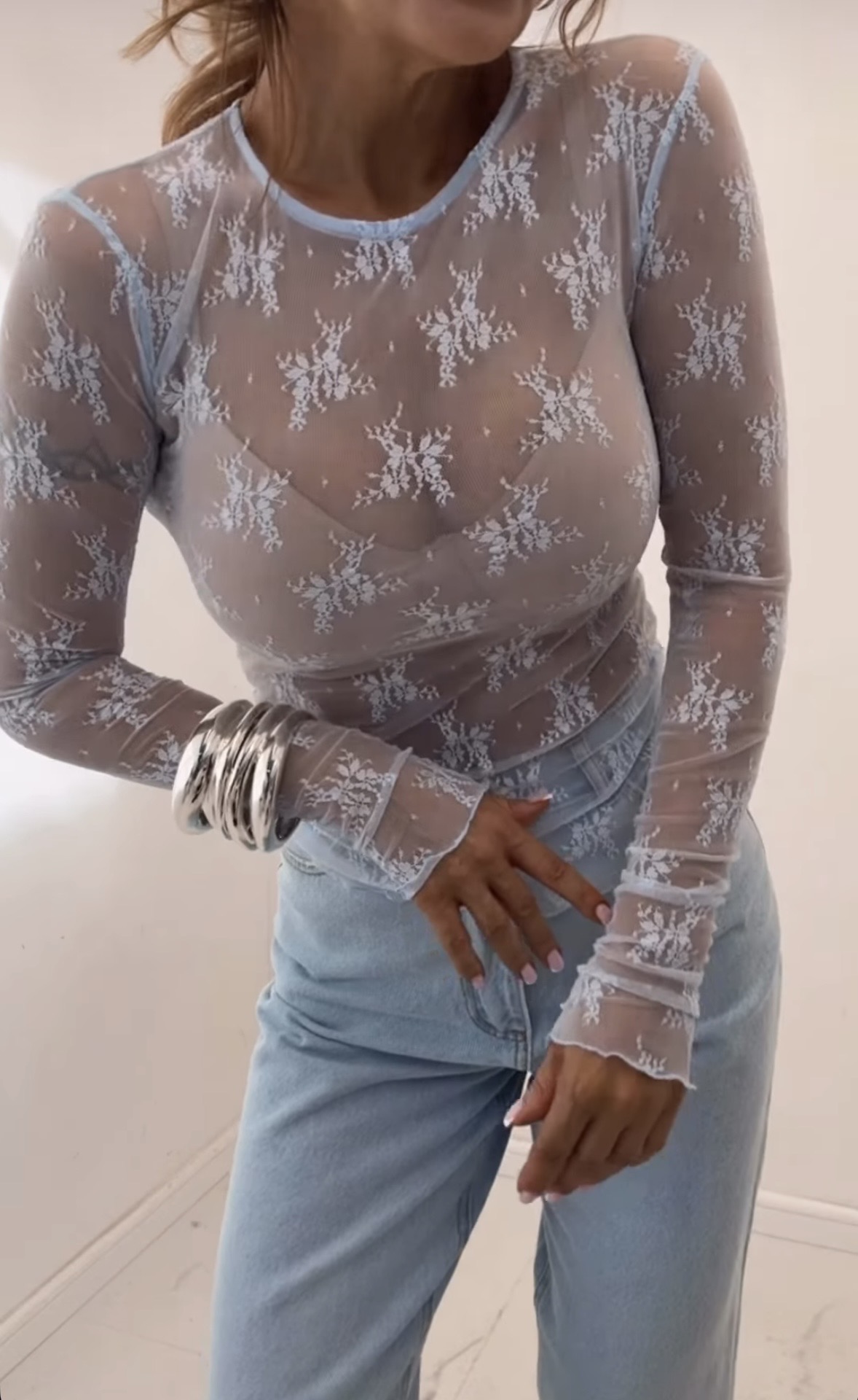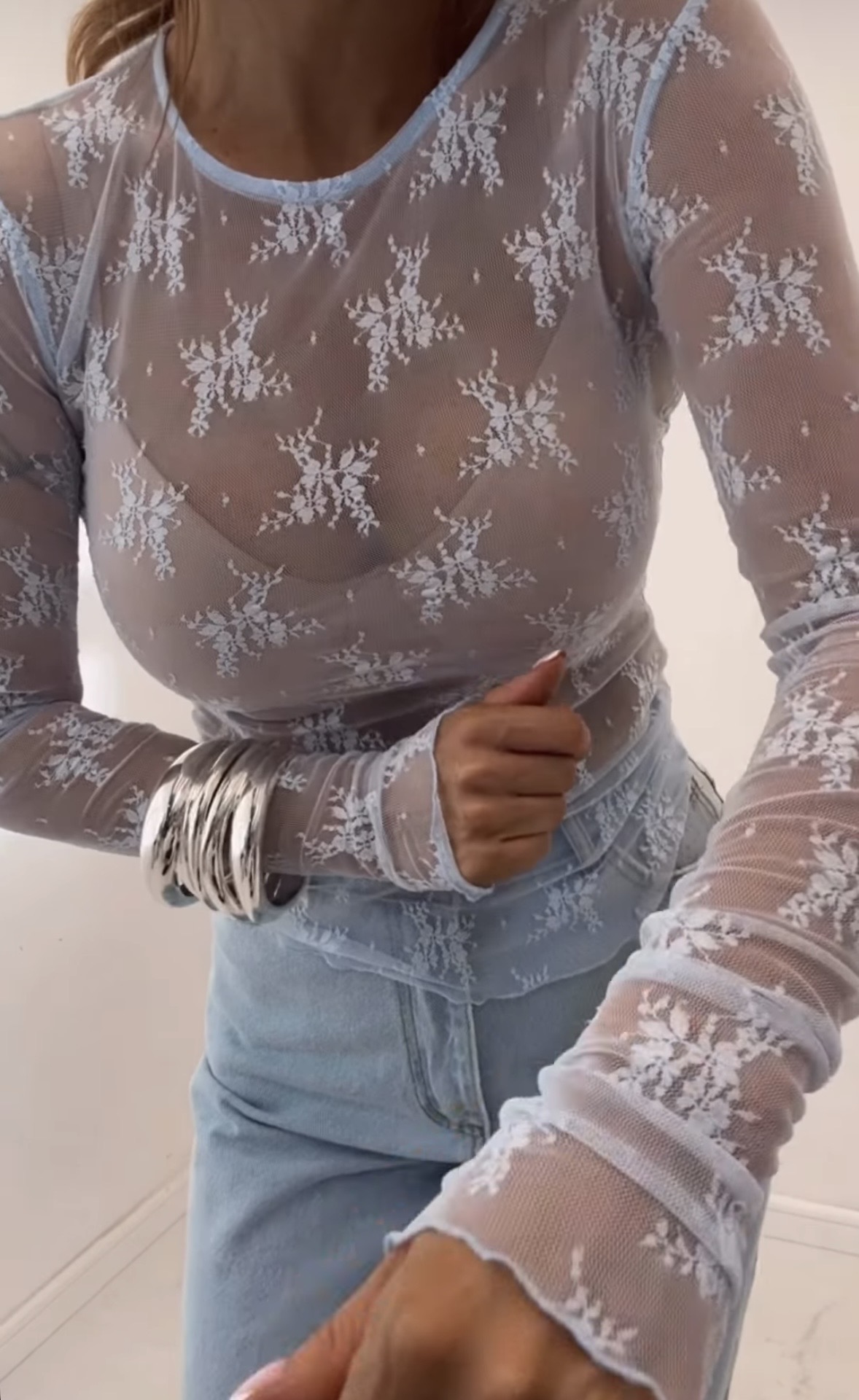 Elegancka bluzka koronkowa z długim rękawem | Emo | niebieska bluzka wizytowa