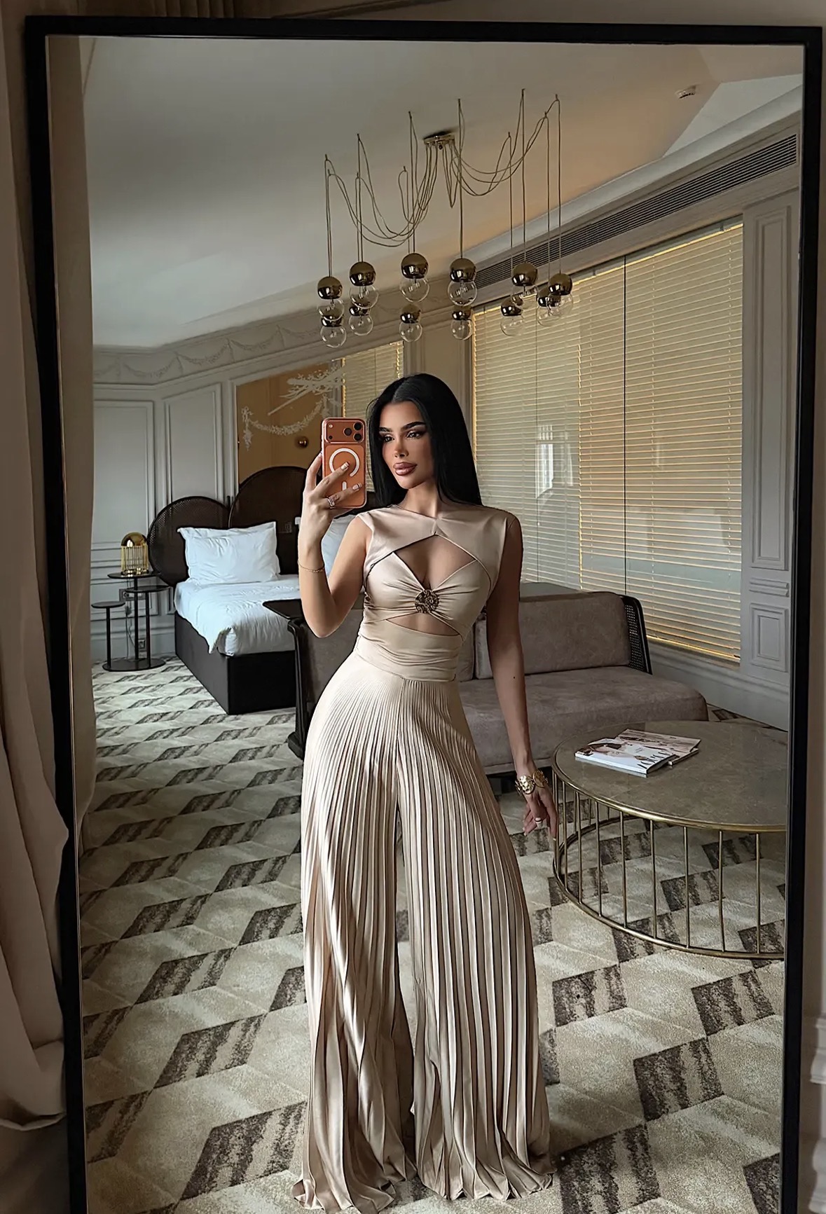 Elegancki kombinezon damski z wycięciami | Roma|– beżowy wyszczuplający i niegniotący się