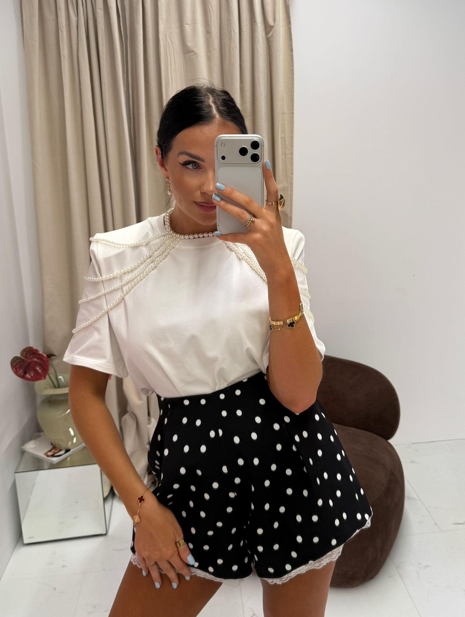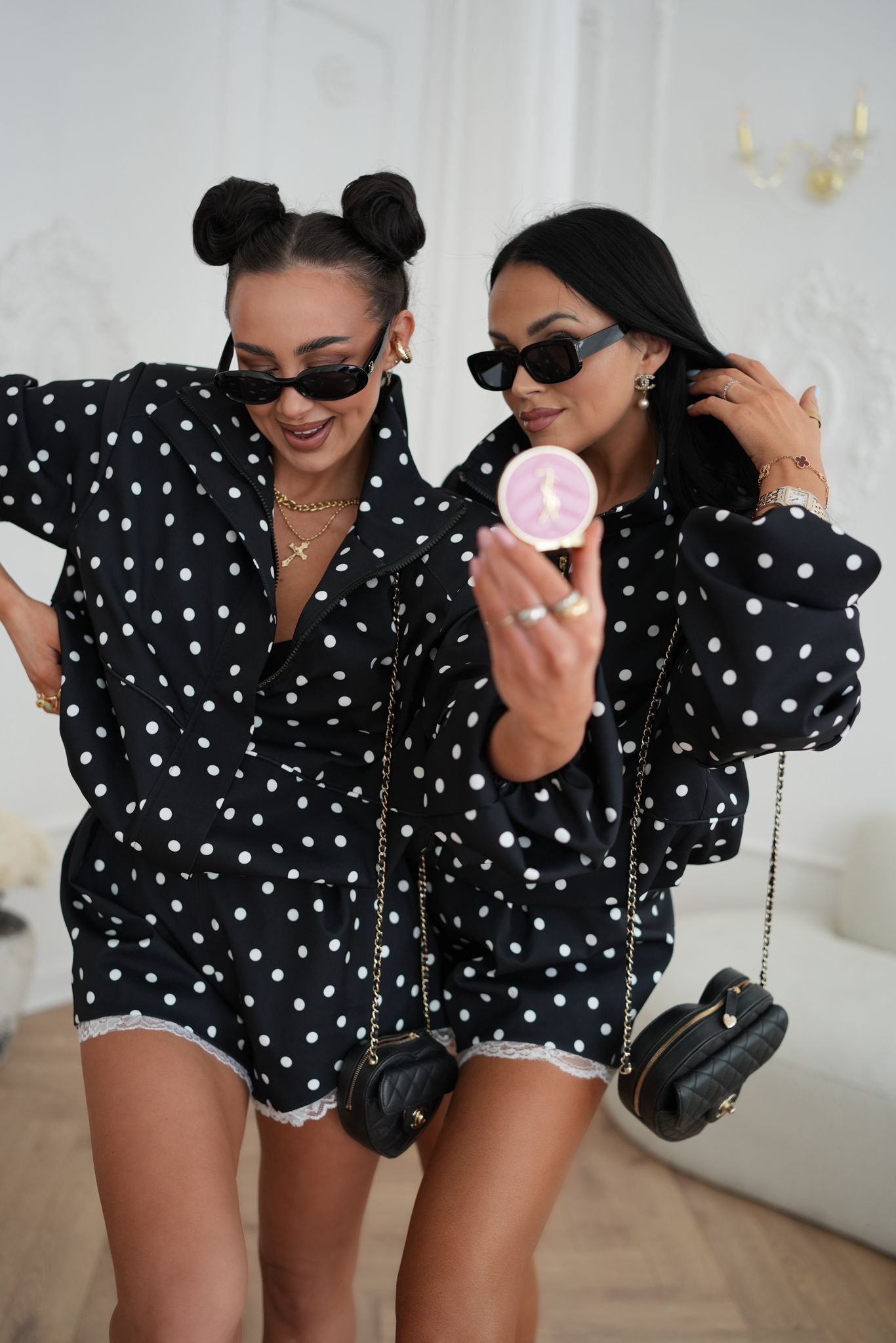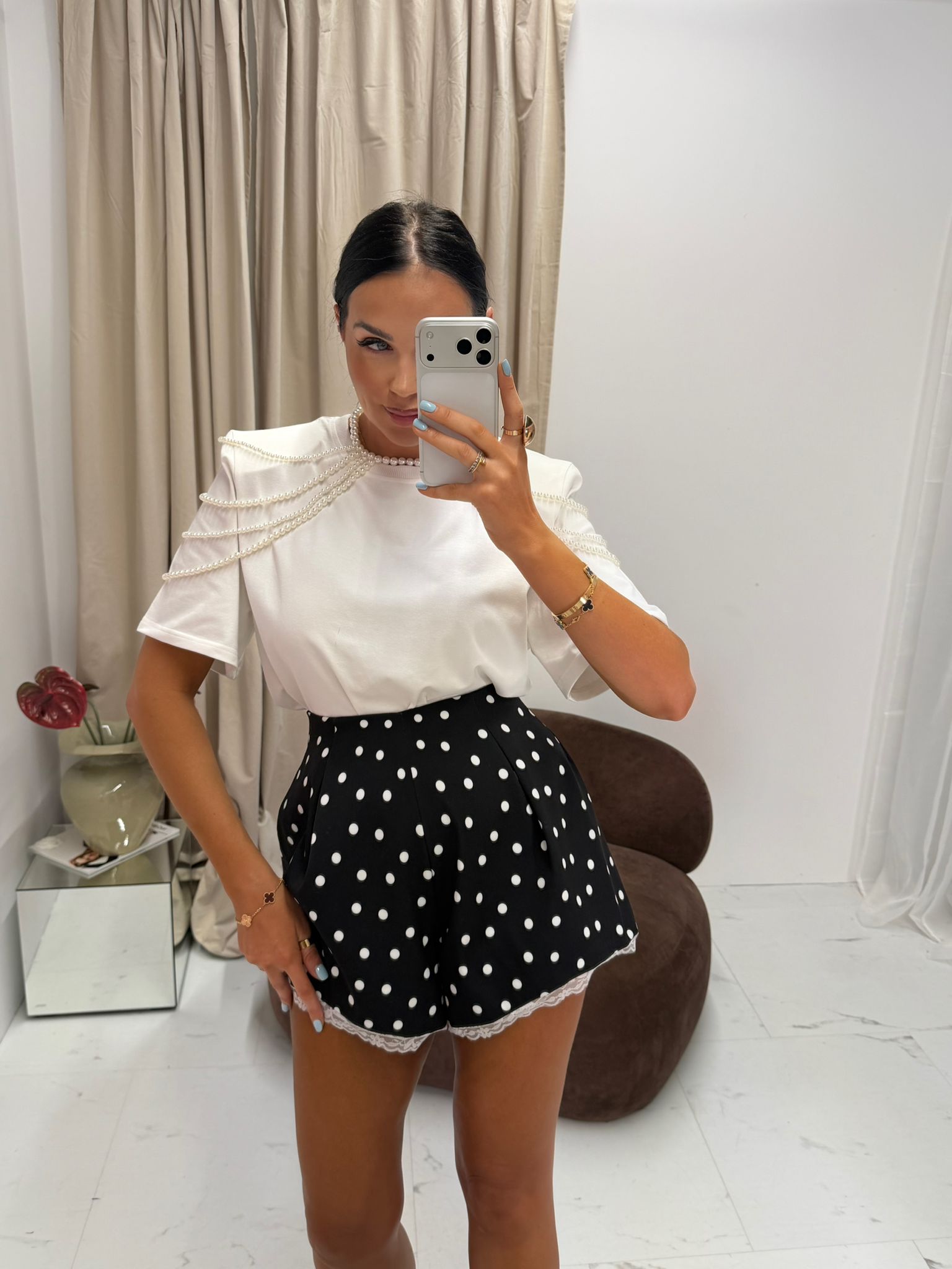 Eleganckie spodenki w grochy z wysokim stanem i koronką | La Milla | czarne szorty wizytowe