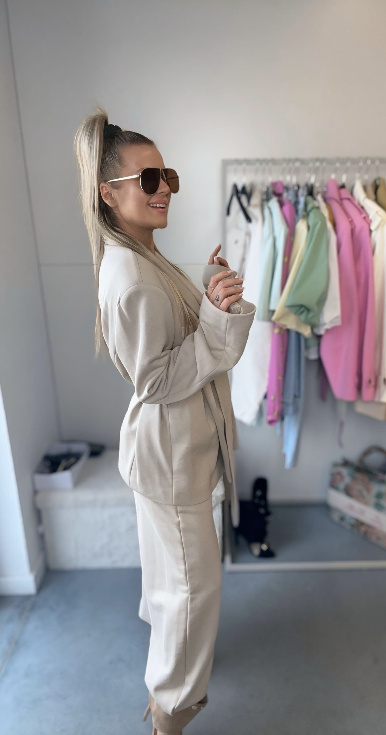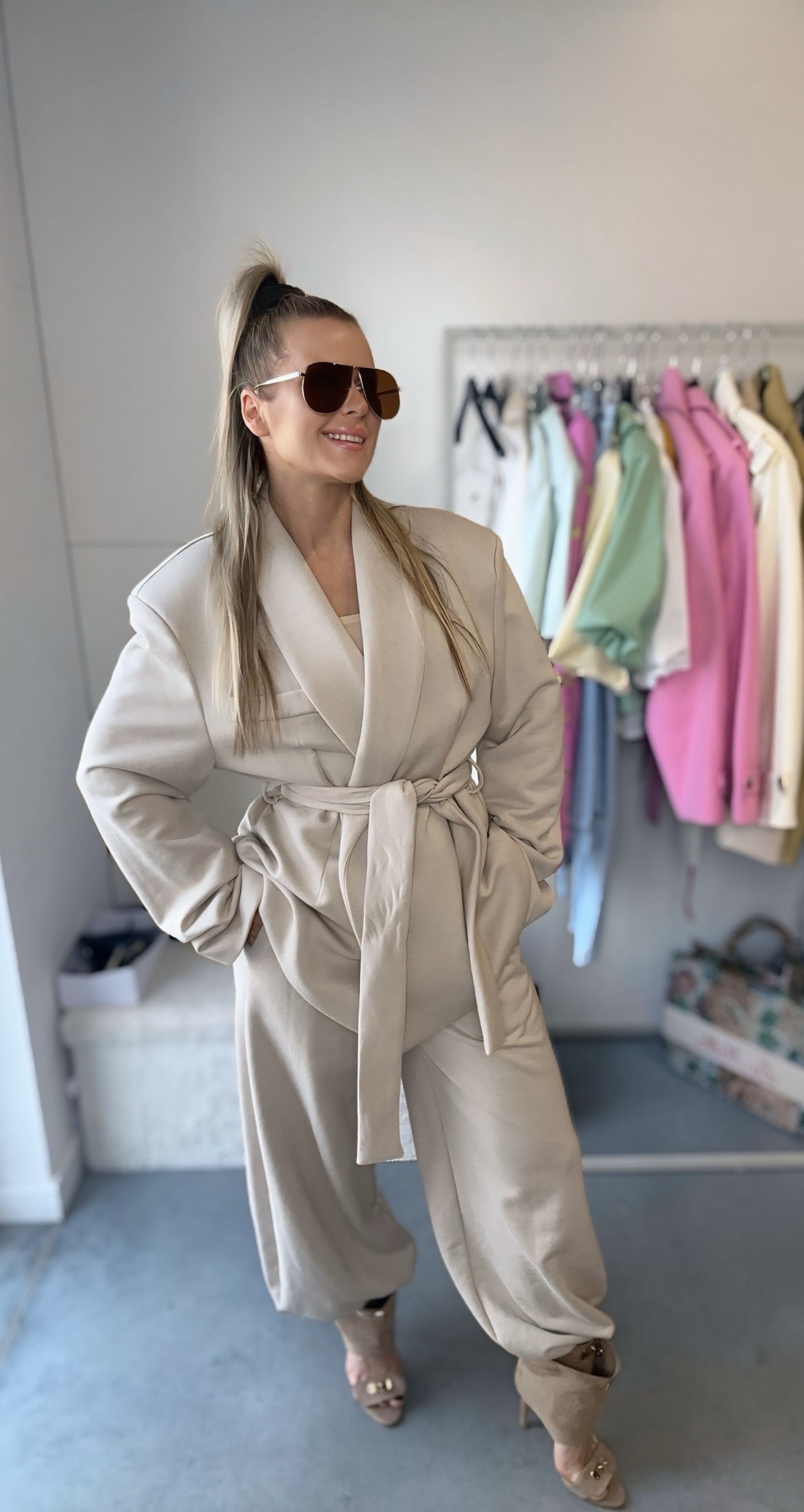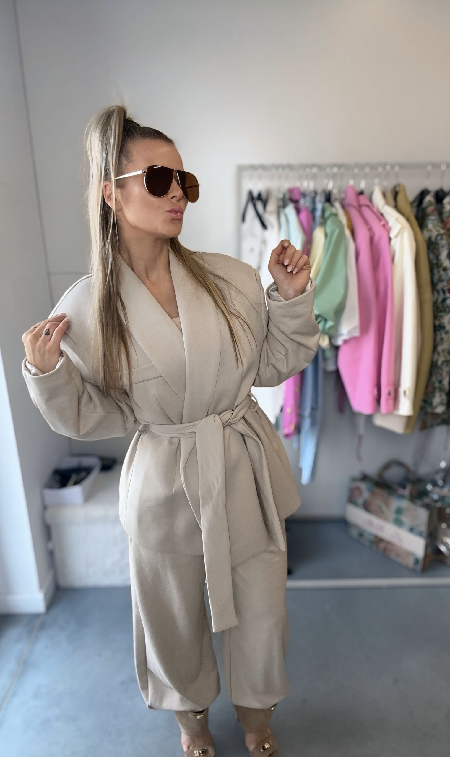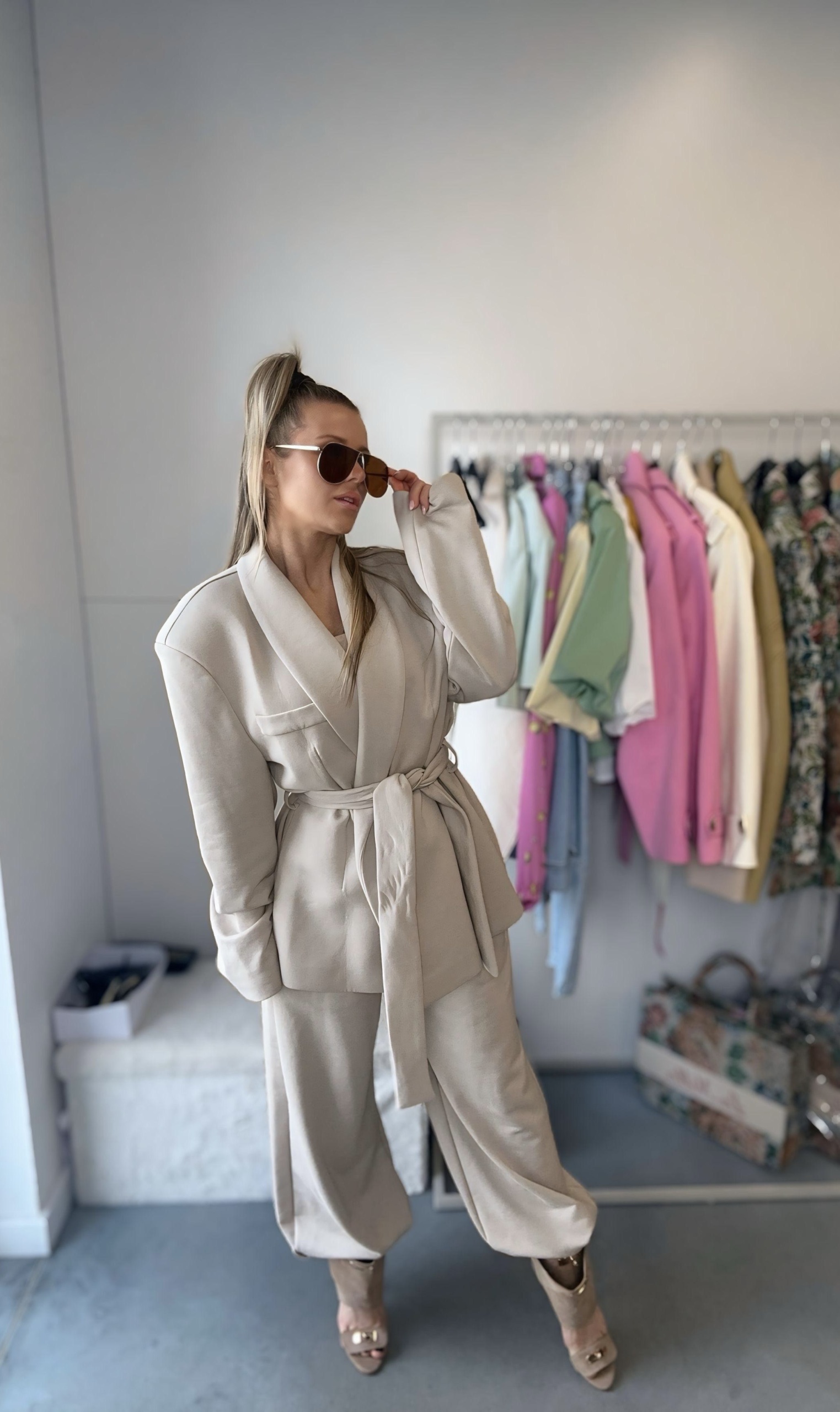 Dresowa marynarka z paskiem to nowoczesna interpretacja klasycznej elegancji w komfortowym wydaniu. Wykonana z miękkiej, elastycznej dzianiny dresowej, zapewnia wygodę noszenia przez cały dzień, jednocześnie zachowując stylowy i schludny wygląd. Posiada imitację kieszonki na wysokości biustu.