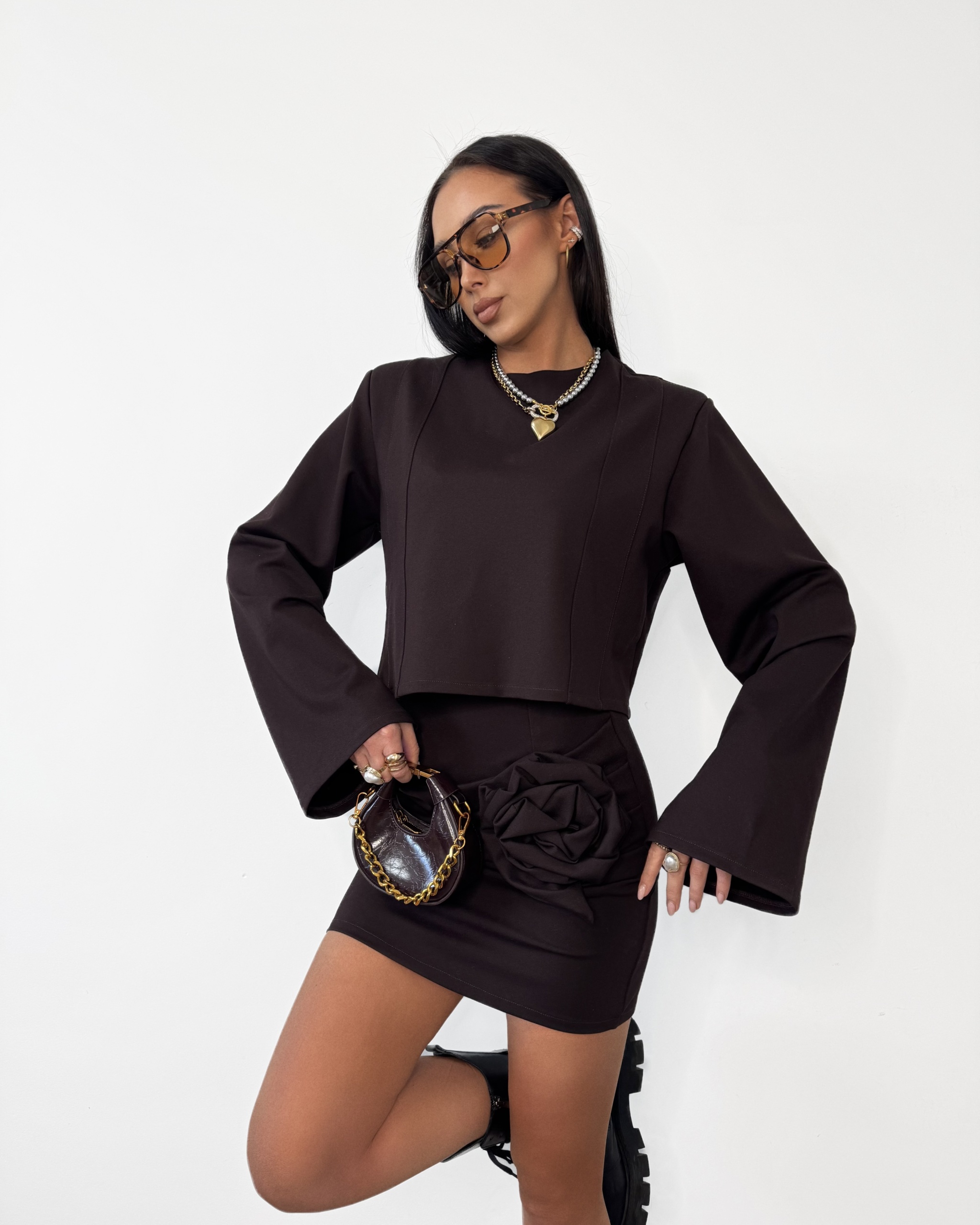 Komplet gładka bluzka długi rękaw i spódniczka kwiatek La Milla – brązowy