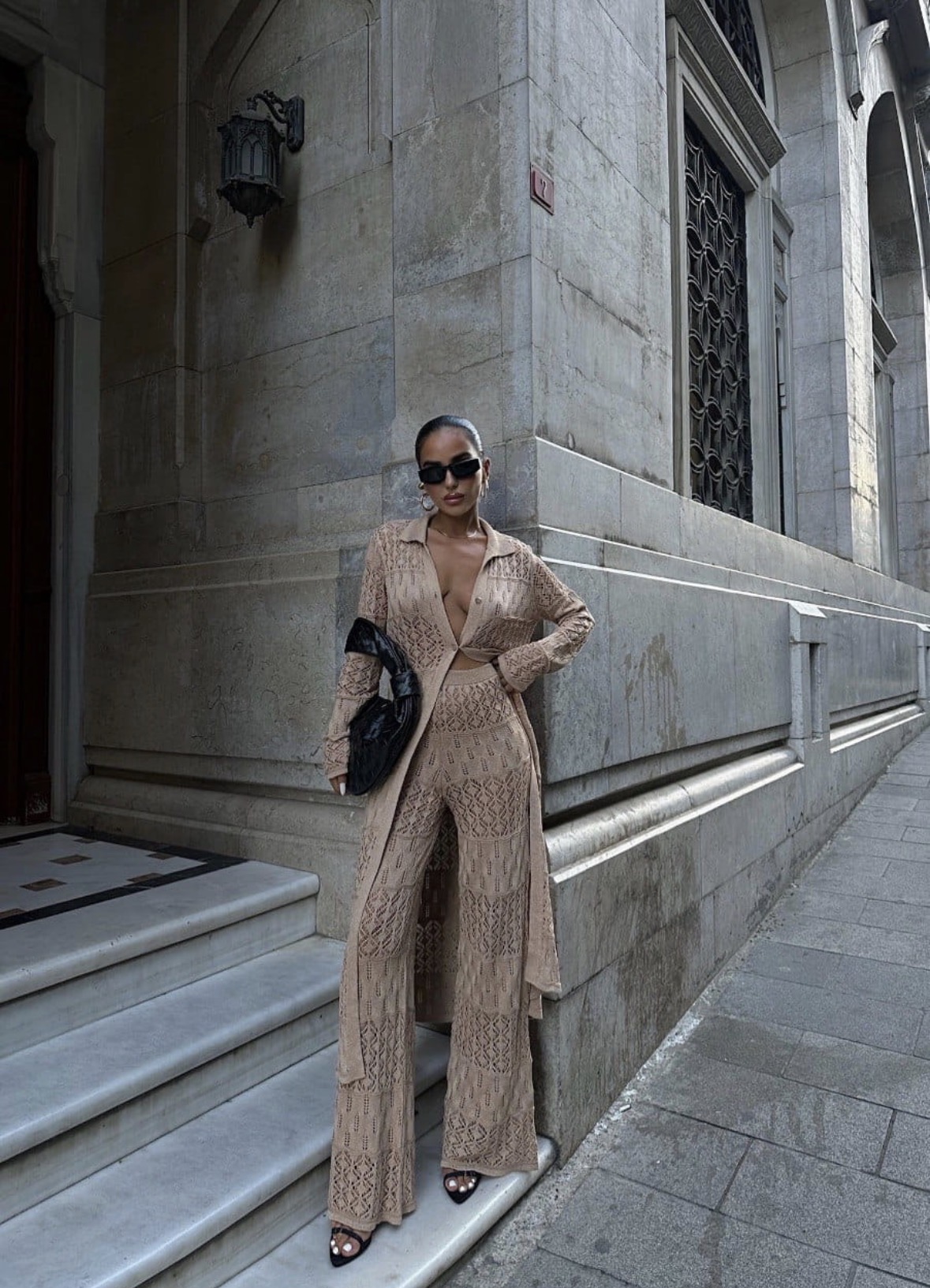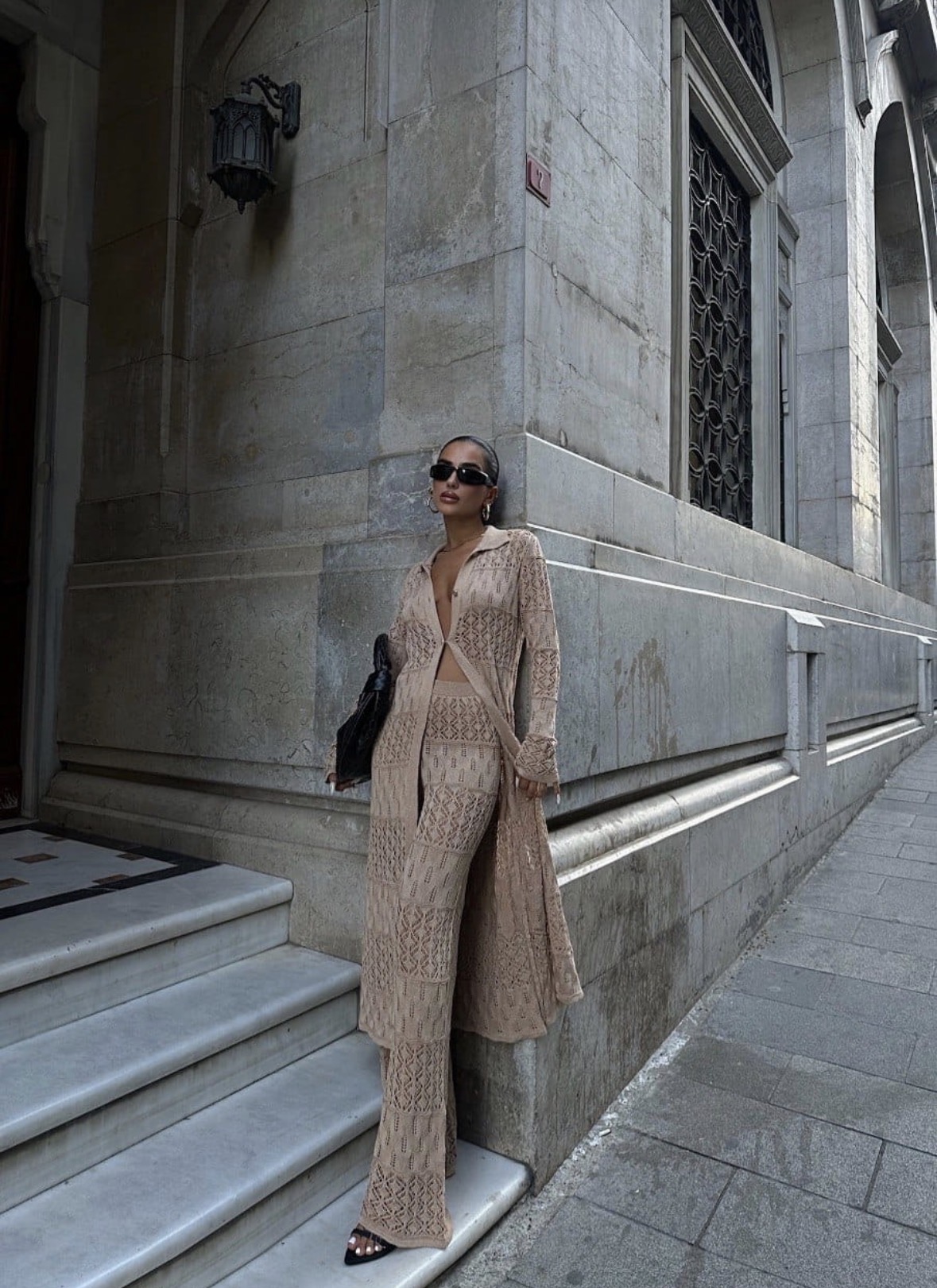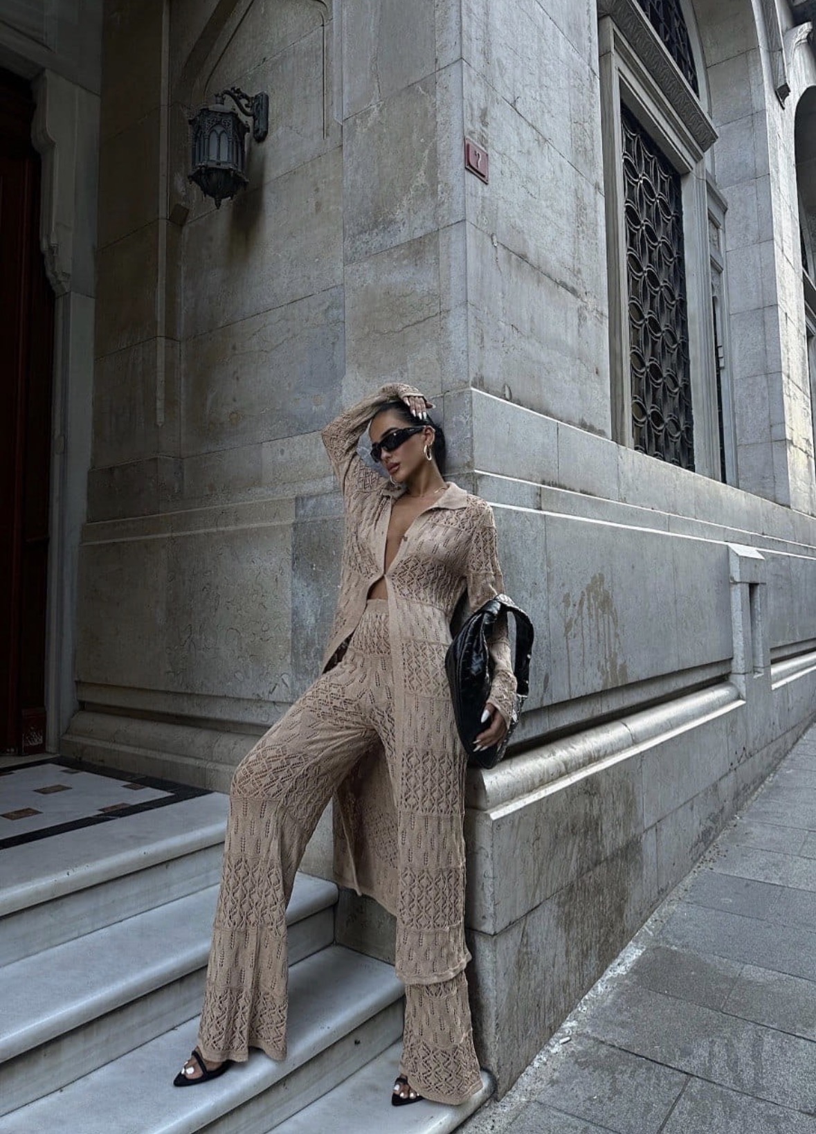Ten dwuczęściowy zestaw składa się z długich, ażurowych spodni z szeroką nogawką oraz dopasowanej narzutki z kołnierzykiem. To idealne rozwiązanie dla kobiet w wieku 25-50 lat, które cenią sobie wyważone połączenie trendów z ponadczasową klasyką. Beżowy kolor podkreśla letnią opaleniznę, a ażurowy splot sprawia, że komplet jest niezwykle lekki i przewiewny, co czyni go bezpiecznym wyborem nawet na największe upały.