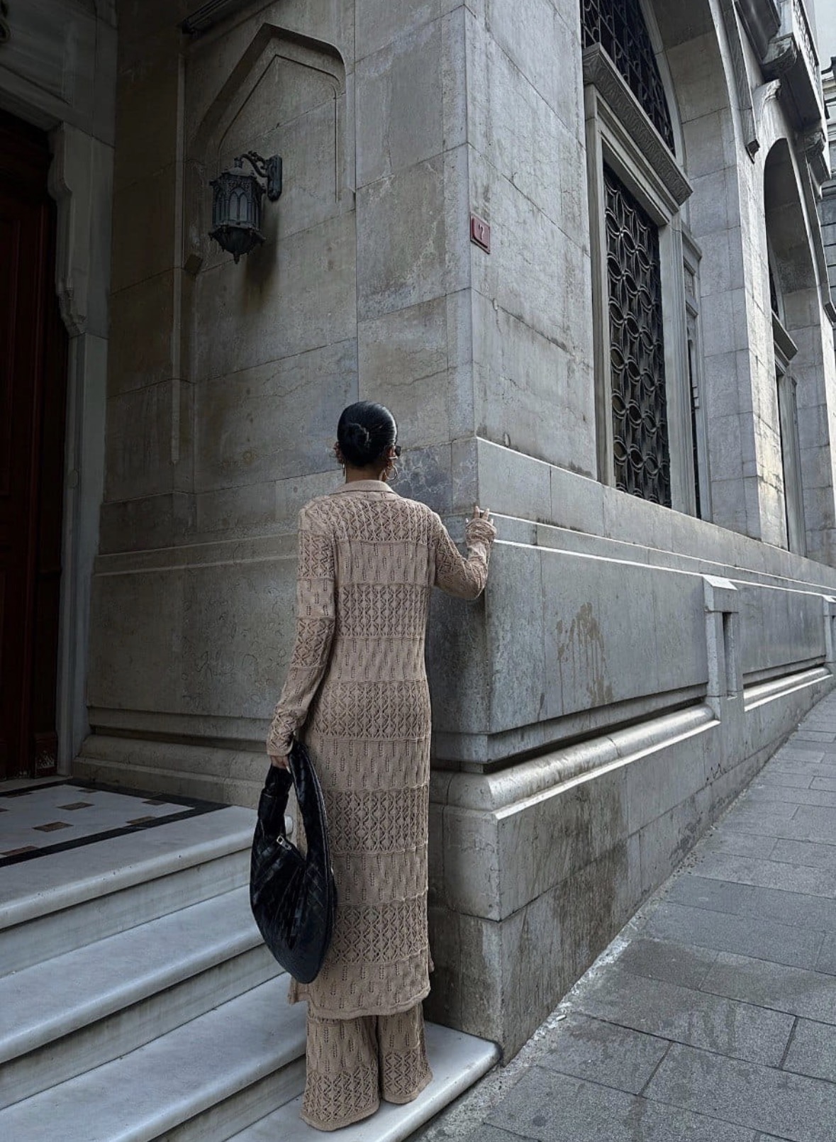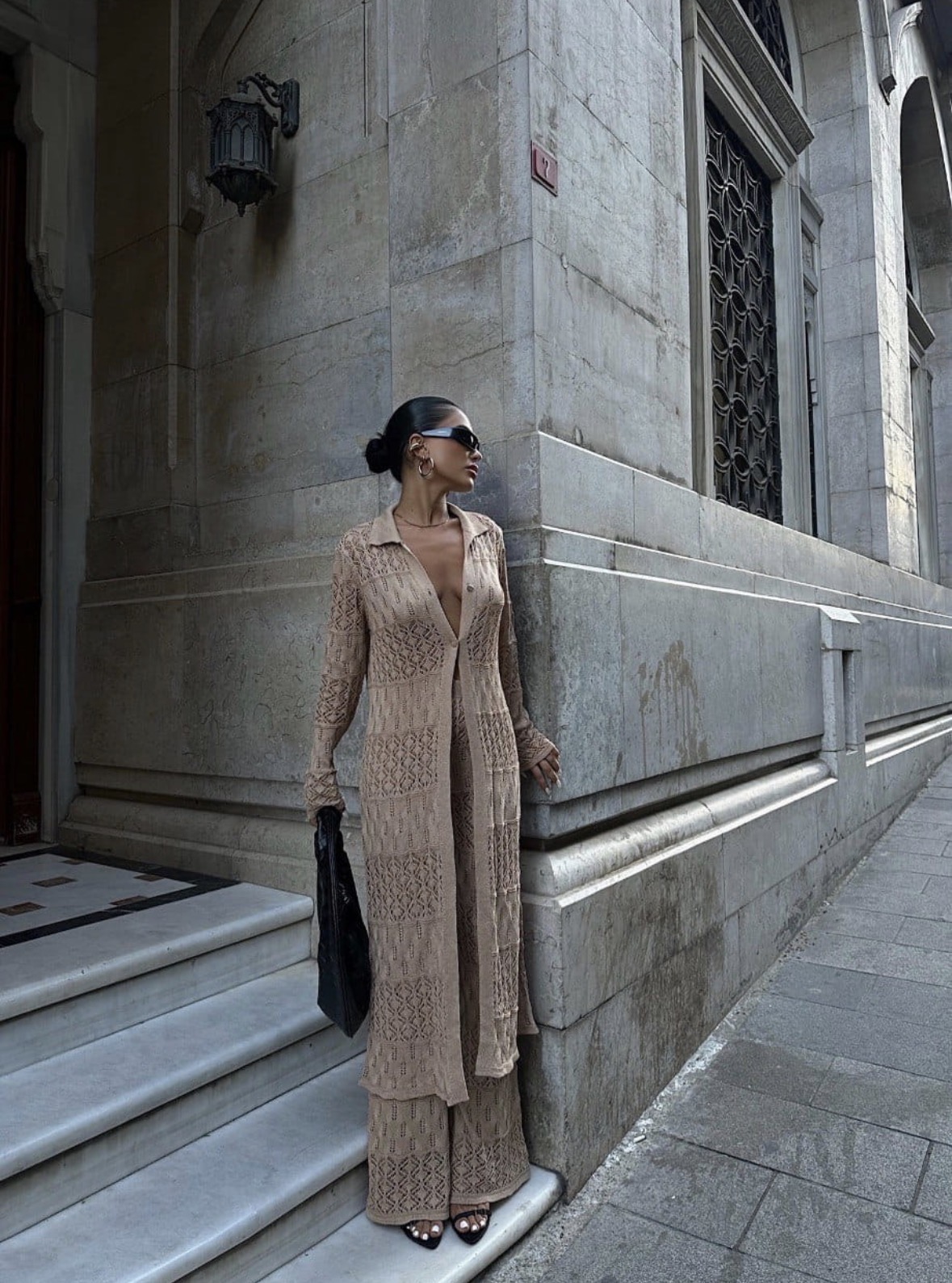 • Letnia kolacja: Połącz komplet z eleganckimi sandałkami i złotą biżuterią, tworząc stylizację w duchu „quiet luxury”.
