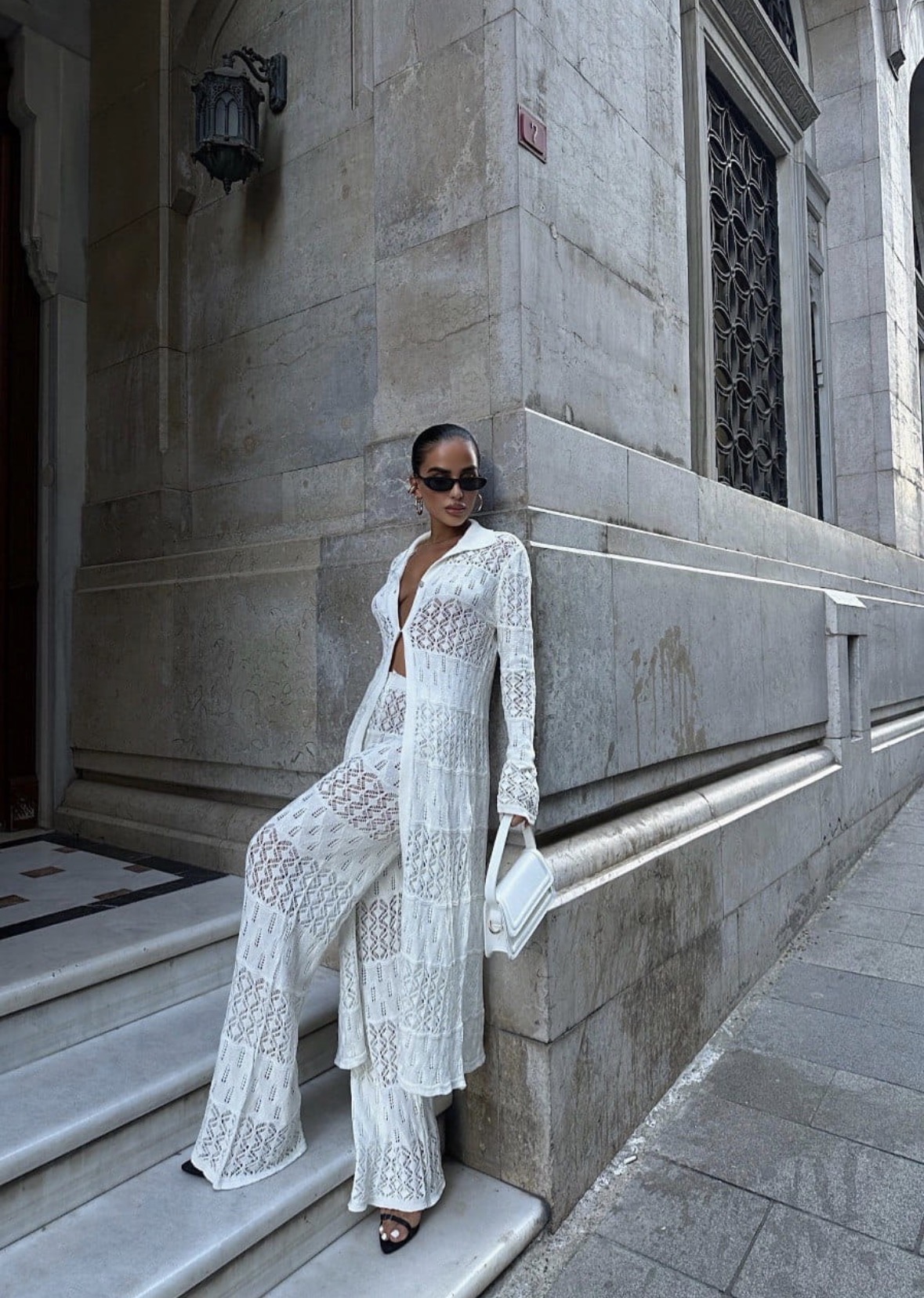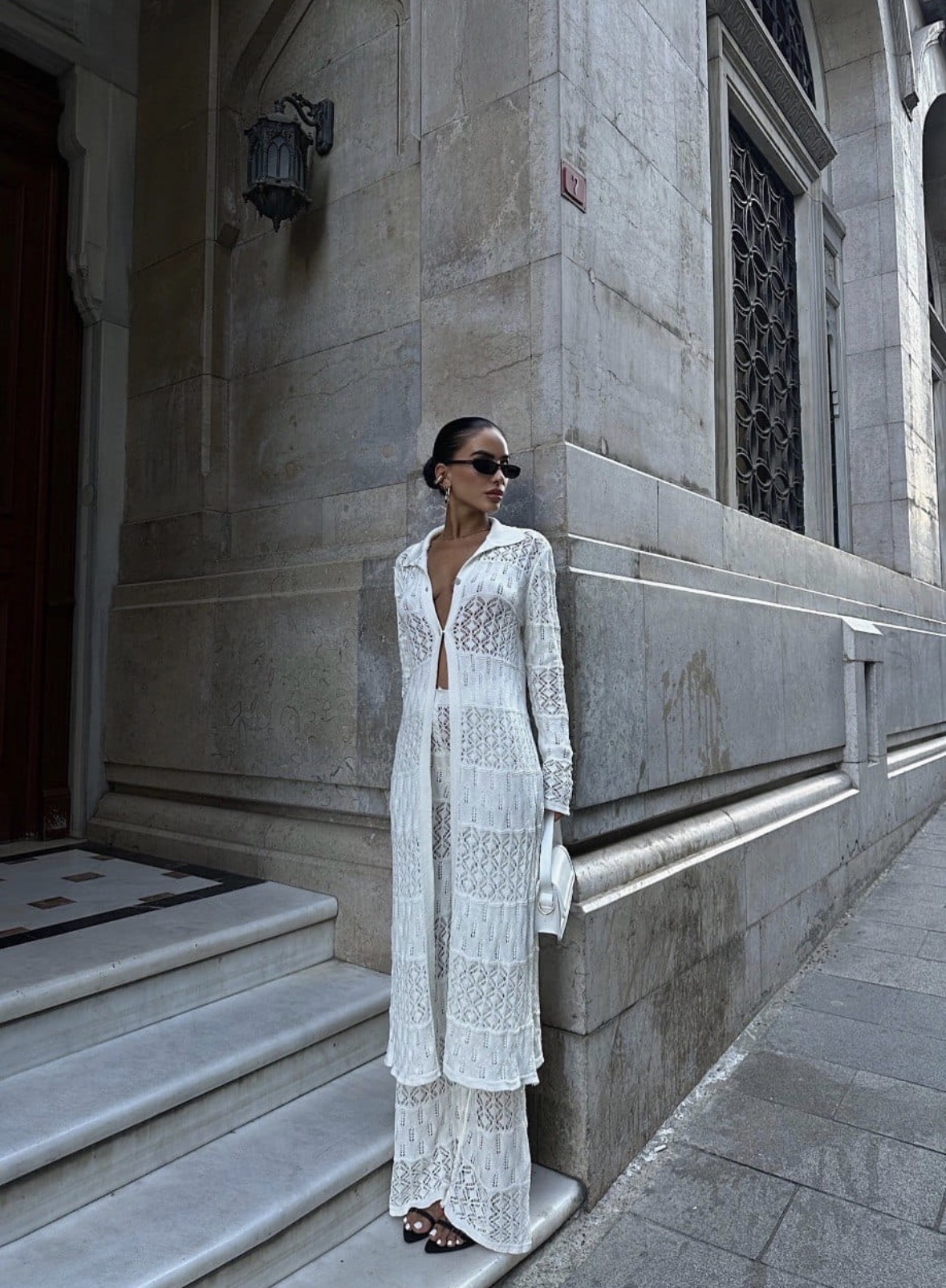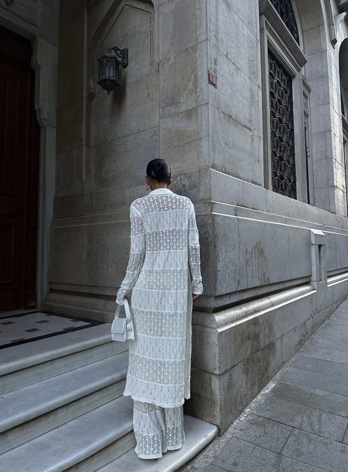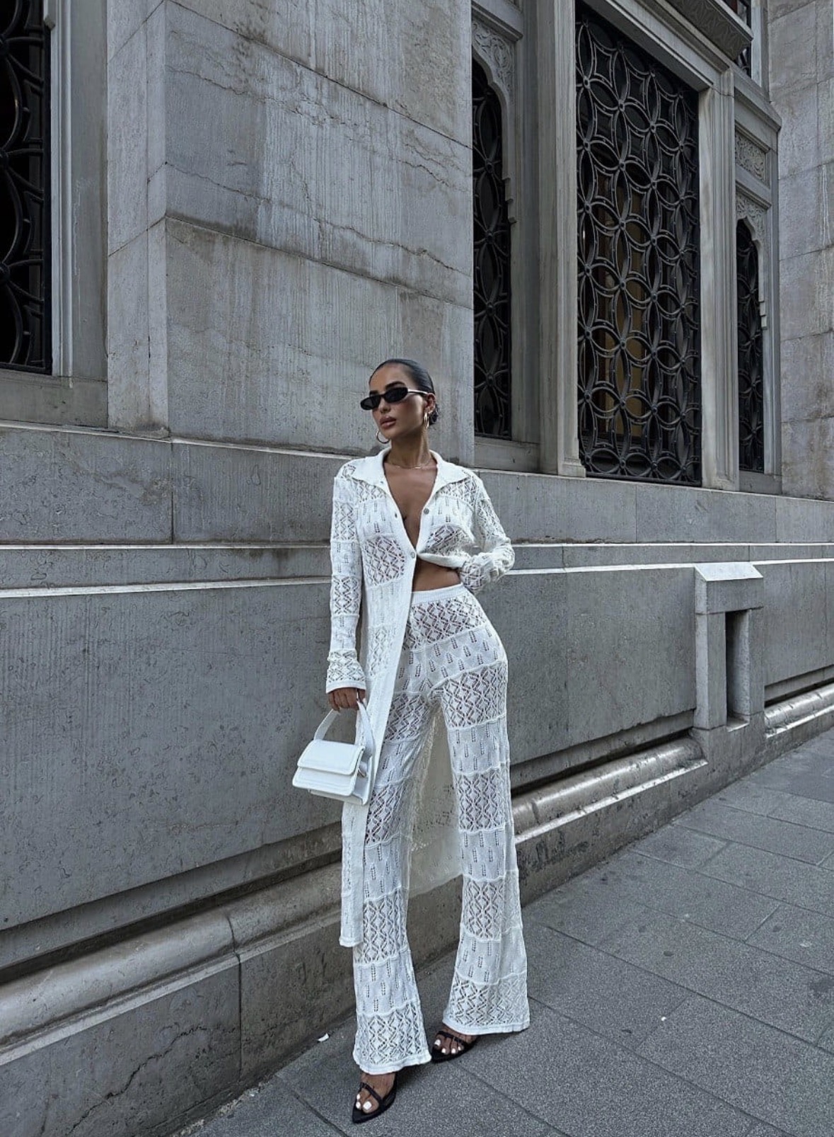 Strona główna Odzież damska PREMIUM 💎 Komplet szydełkowy ażurowy | Croatia | biały przewiewny zestaw na lato i wakacje (spodnie + narzutka)