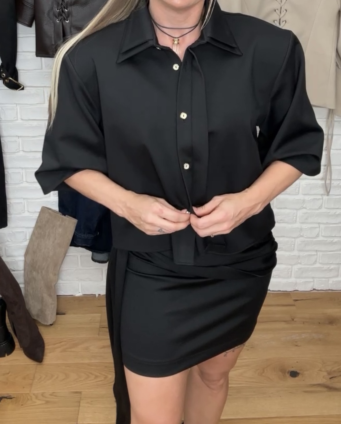 Cudowny komplet składający się z t-shirtu pudełkowego z poduszkami na ramionach zapinanego na złote guziki oraz spódniczki z szarfą. Bluzka ma oversizowy krój, kryte guziczki oraz podwójny kołnierzyk. Spódniczka ma zdobna szarfę wiązana na różne sposoby – uwaga rozmiarówka wypada mniejsza ! ( rozmiary xs, s, m, l)