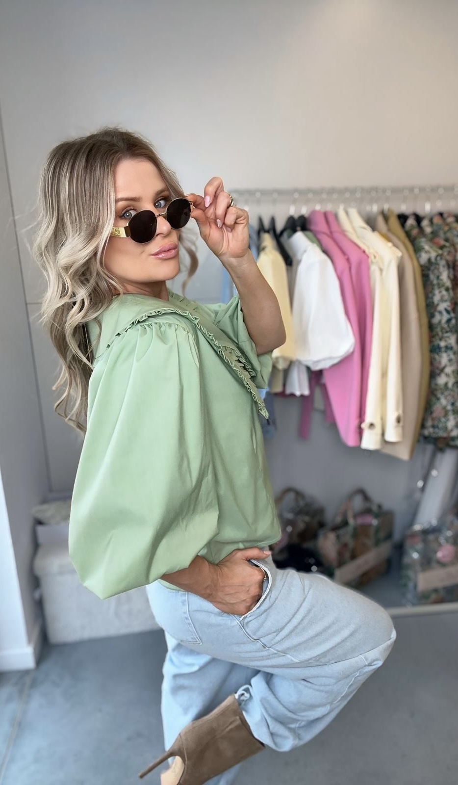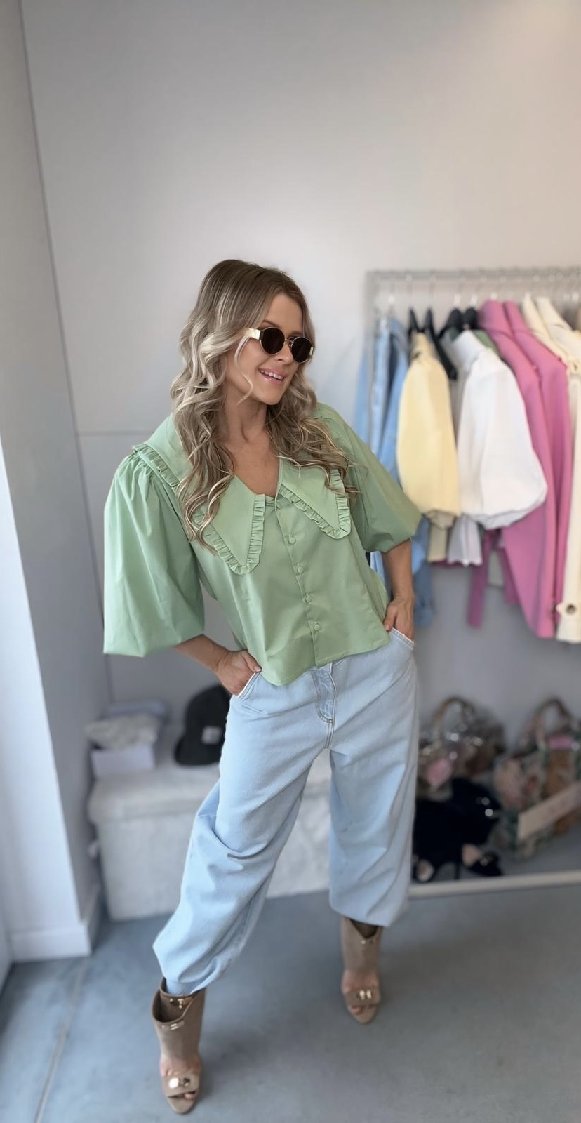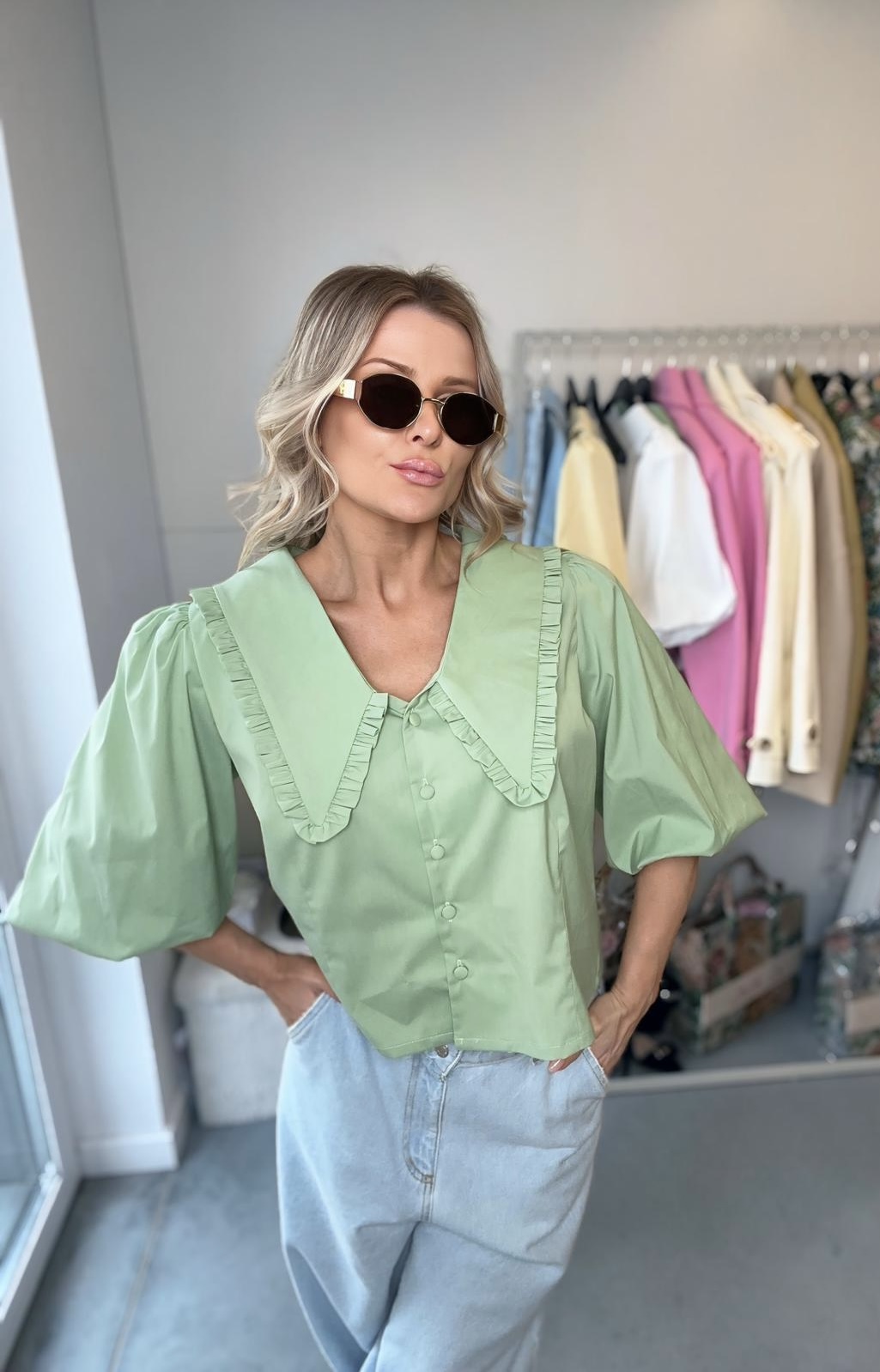 Największą robotę robi tutaj kołnierz — szeroki, wykończony falbanką, tworzy bardzo stylowy i trochę romantyczny look. To właśnie ten detal sprawia, że nawet najprostsza stylizacja z jeansami wygląda dopracowanie i „z pomysłem”.