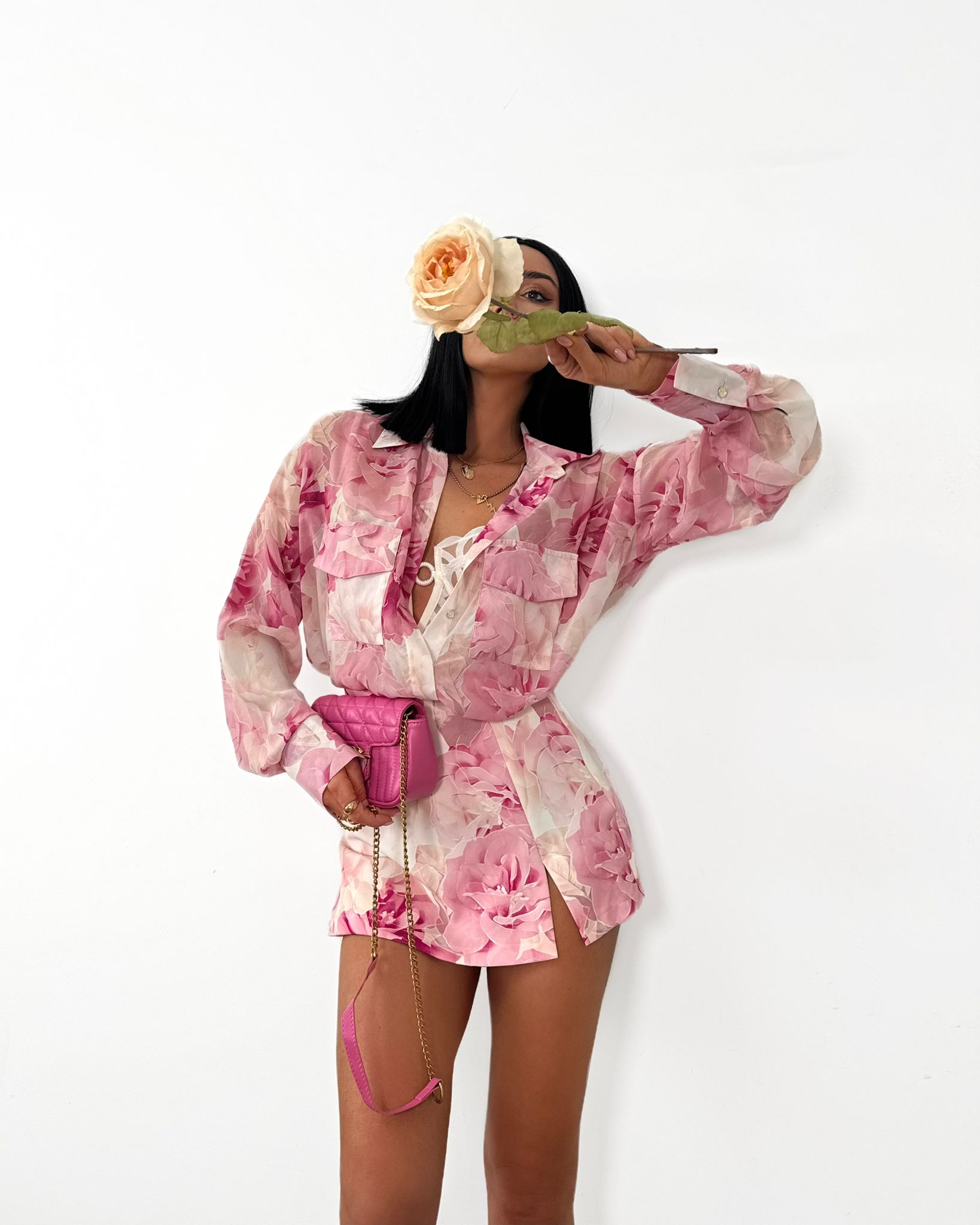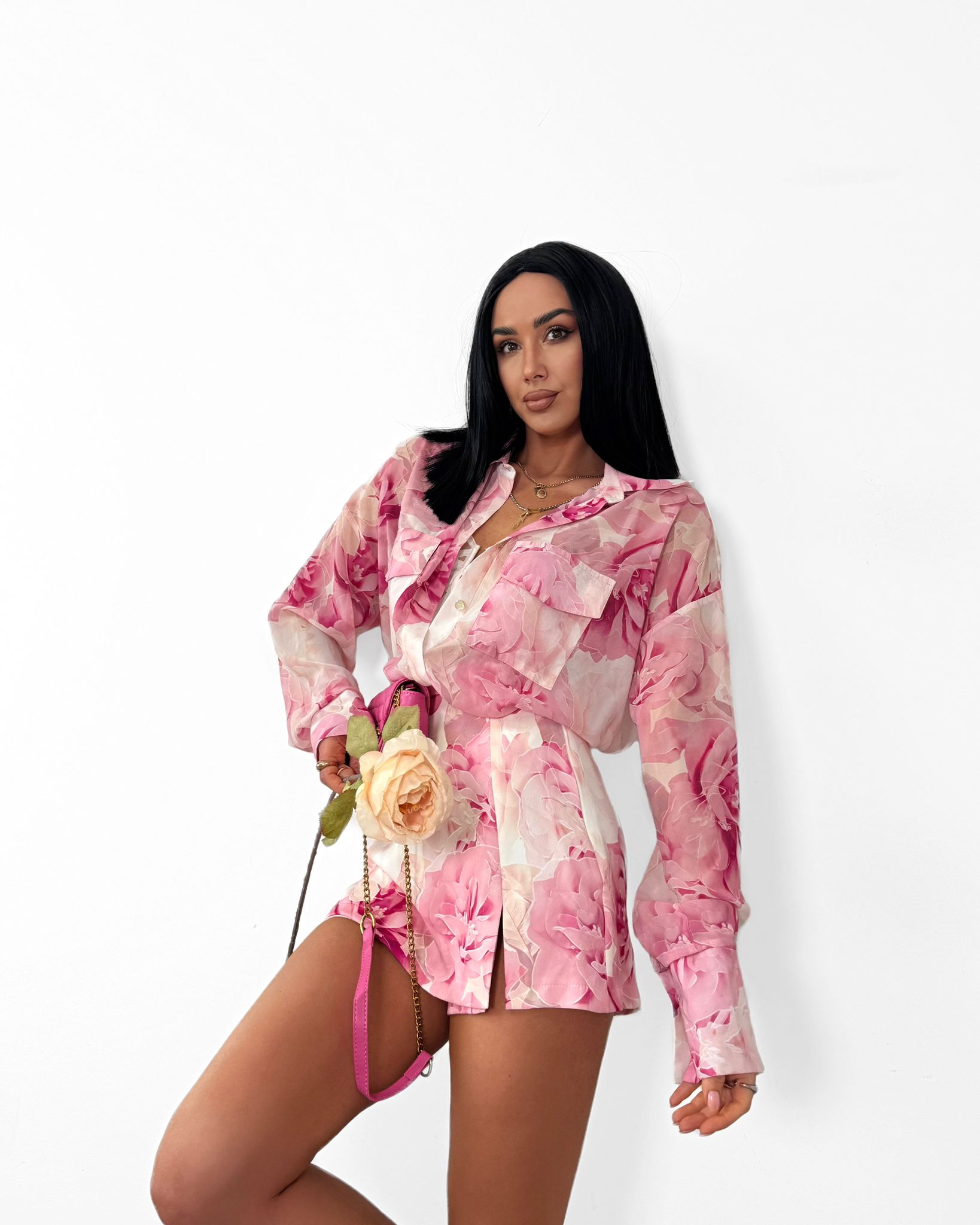 Strona główna Odzież damska Koszule Komplet koszula damska i spódnico-spodenki w róże różowa La Milla – elegancki komplet z wiskozą