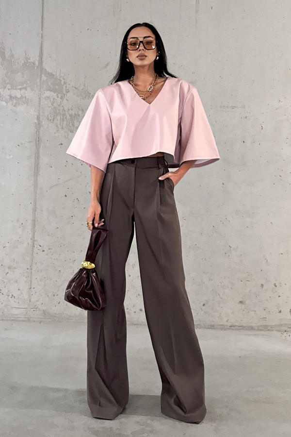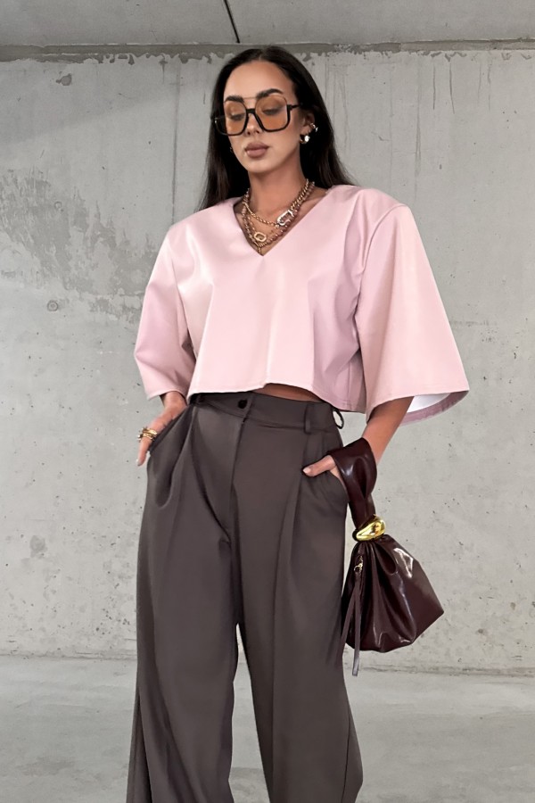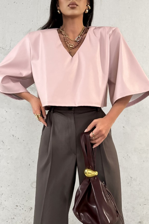 Krótki T-shirt z eco skóry marki LaMilla to propozycja dla kobiet, które lubią wyróżniać się stylowym minimalizmem. Fantastyczny krój oversize, co powoduje że będzie pasowała do obcisłej spódniczki lub jeansów.