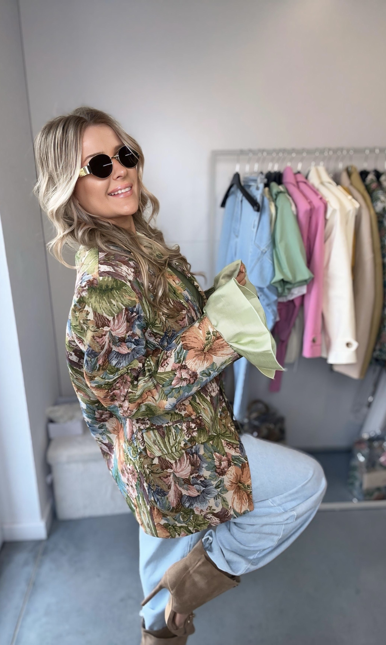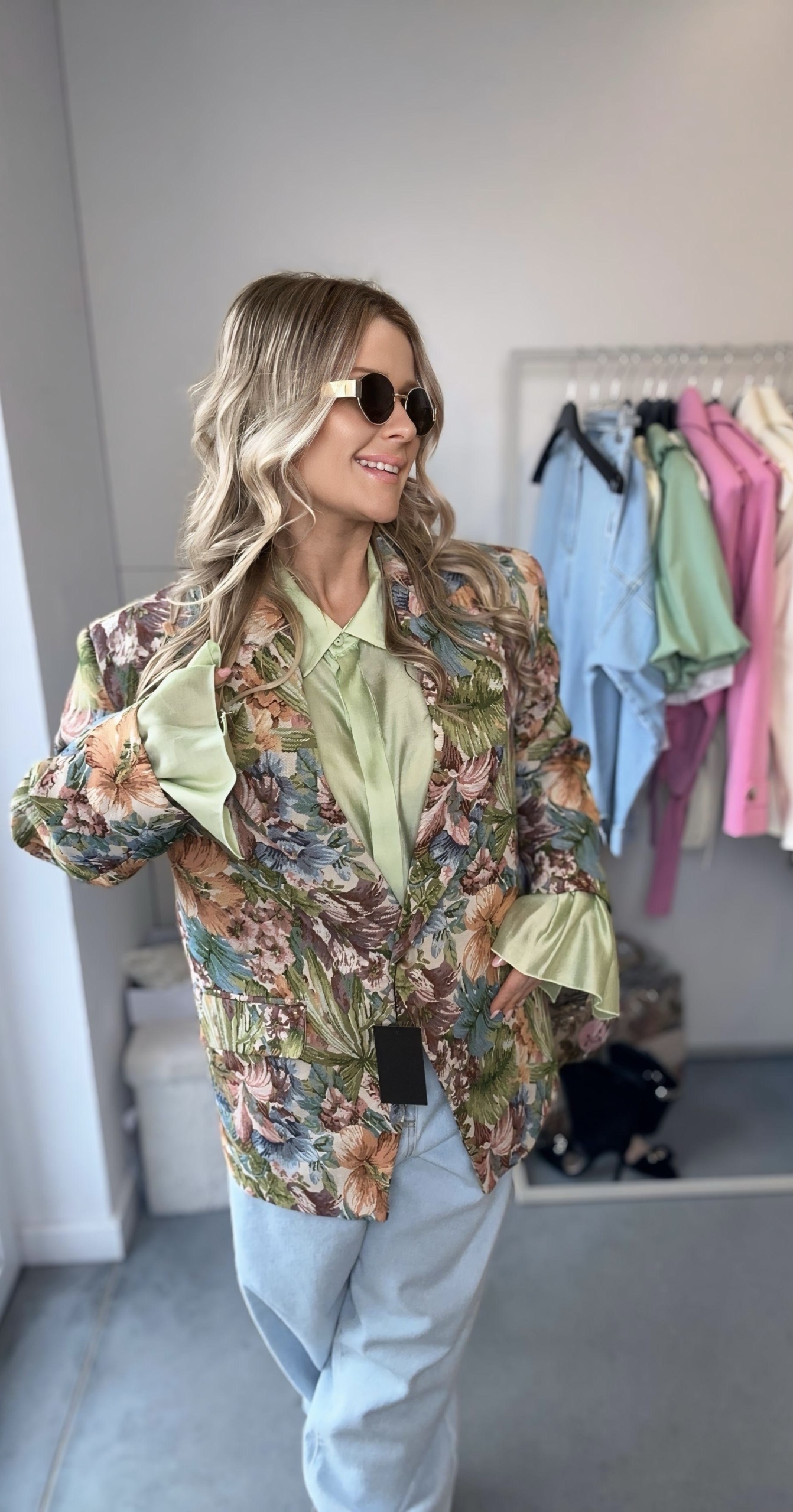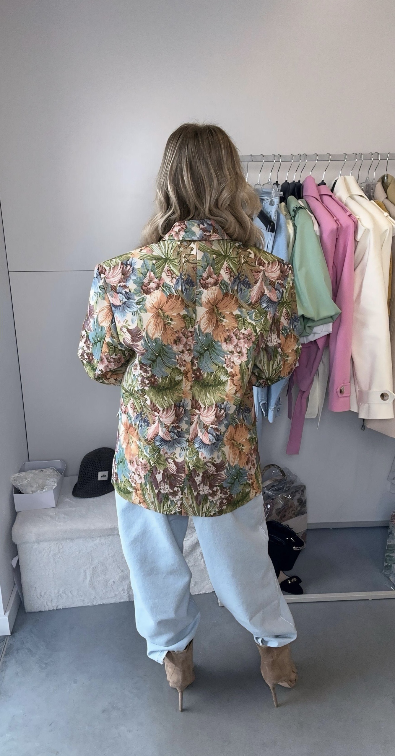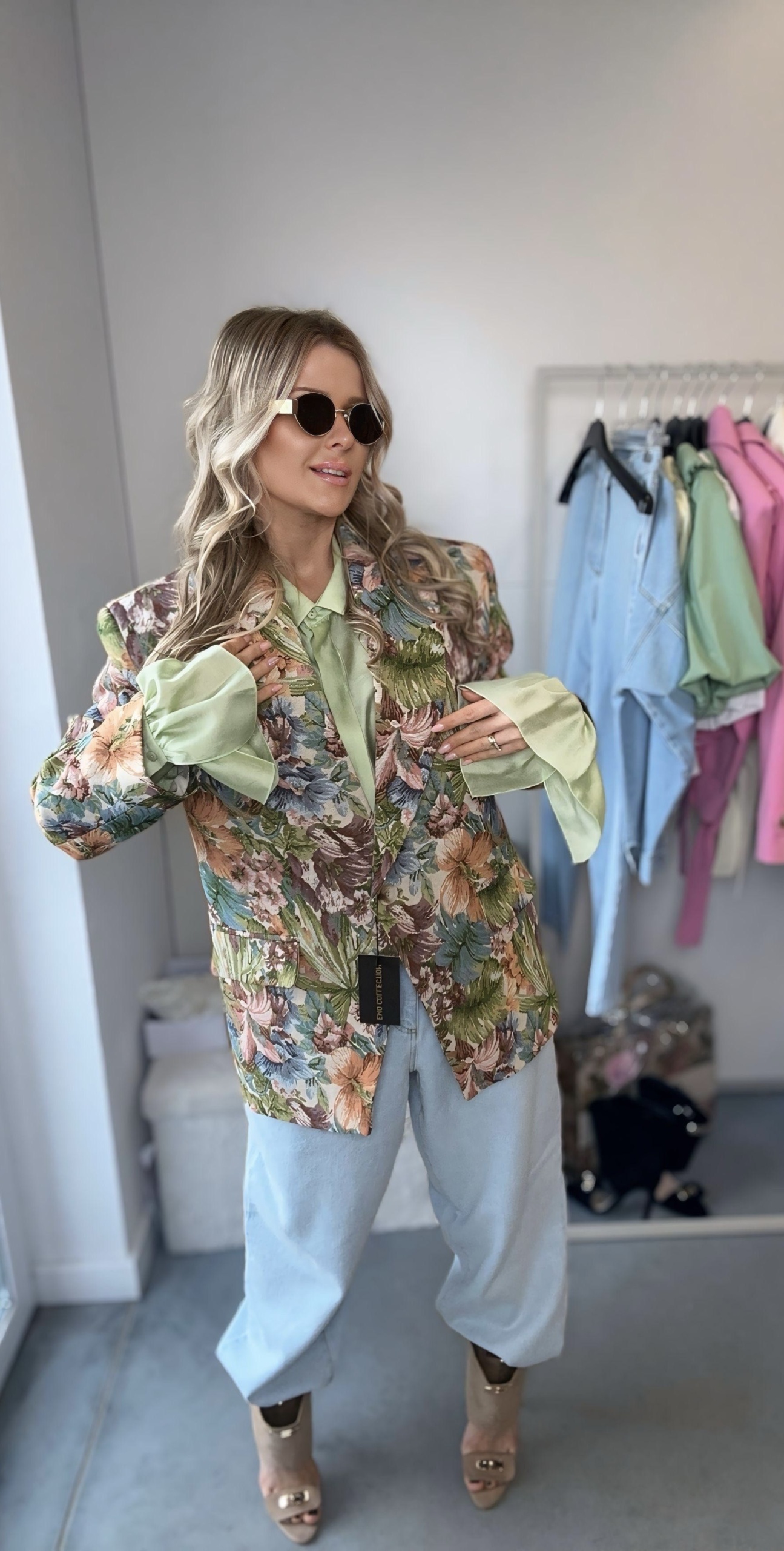 To nie jest zwykła marynarka — to element, który robi cały outfit. Kolorowy, roślinny print świetnie łączy się z prostymi базami jak jeansy czy top, dzięki czemu możesz stworzyć stylizację bez większego wysiłku, a efekt i tak będzie wow.