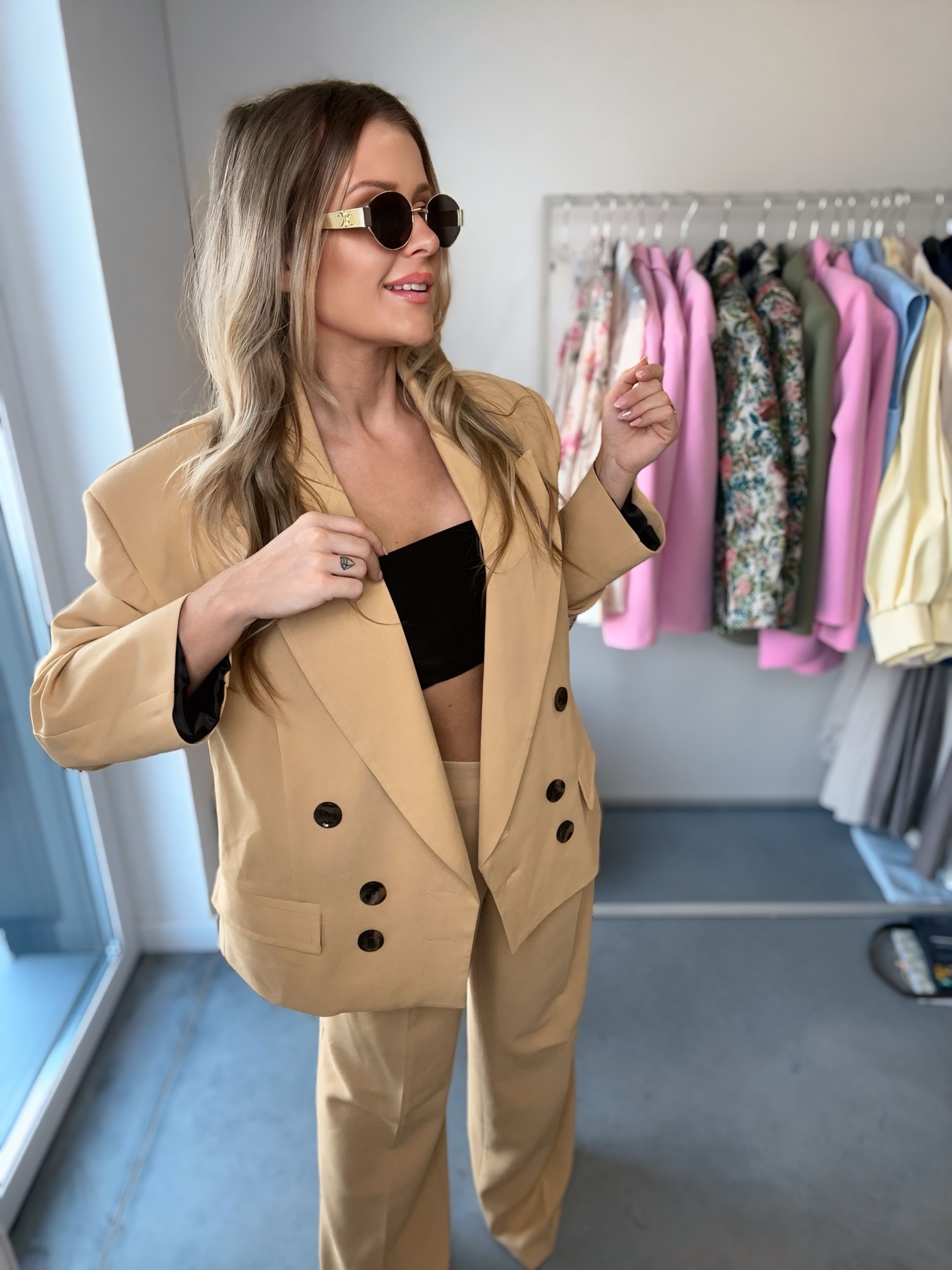 Marynarka doskonale sprawdzi się zarówno w komplecie ze spodniami garniturowymi, tworząc spójną i szykowną stylizację, jak i w zestawieniu z jeansami lub spódnicą – na co dzień i na specjalne okazje. Wysokiej jakości materiał zapewnia komfort noszenia oraz idealne układanie się na sylwetce.
