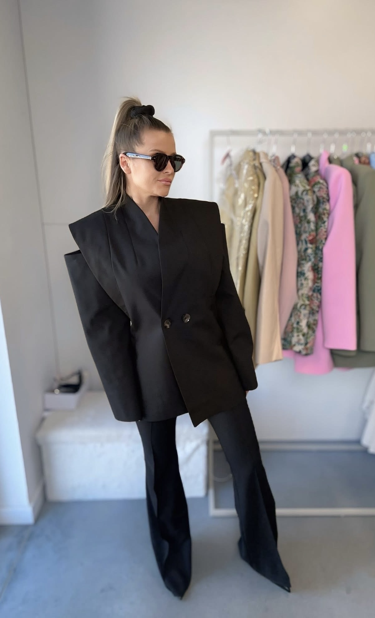Oryginalna marynarka z odkrytymi ramionami La Milla w modnym, oversizowym fasonie, bez zapięcia, z ozdobnymi guzikami na przodzie. Długie, proste rękawy z wycięciami na ramionach oraz dekolt ze stójką nadają jej nowoczesnego charakteru. Marynarka posiada komfortową podszewkę, łącząc styl i wygodę – idealna do casualowych i eleganckich stylizacji.