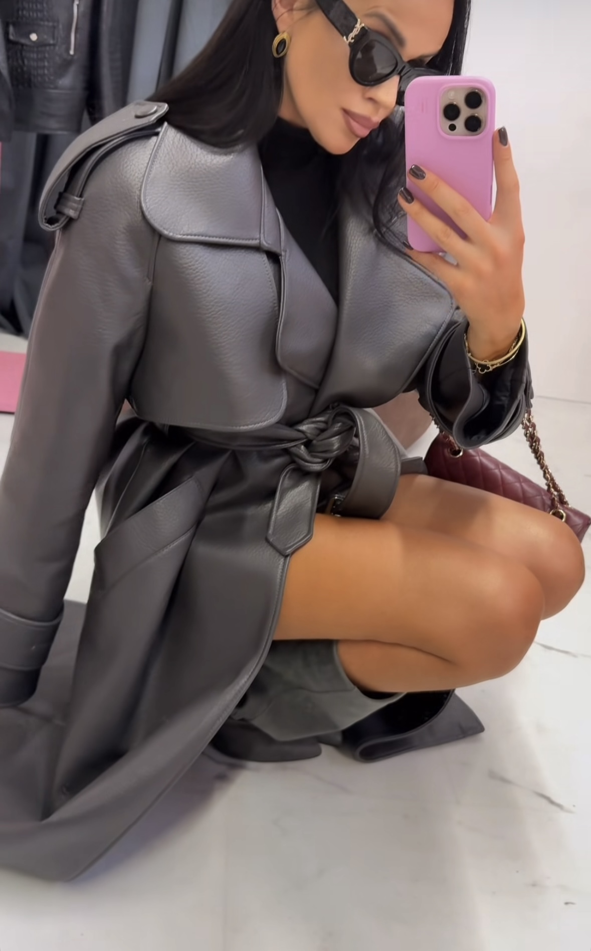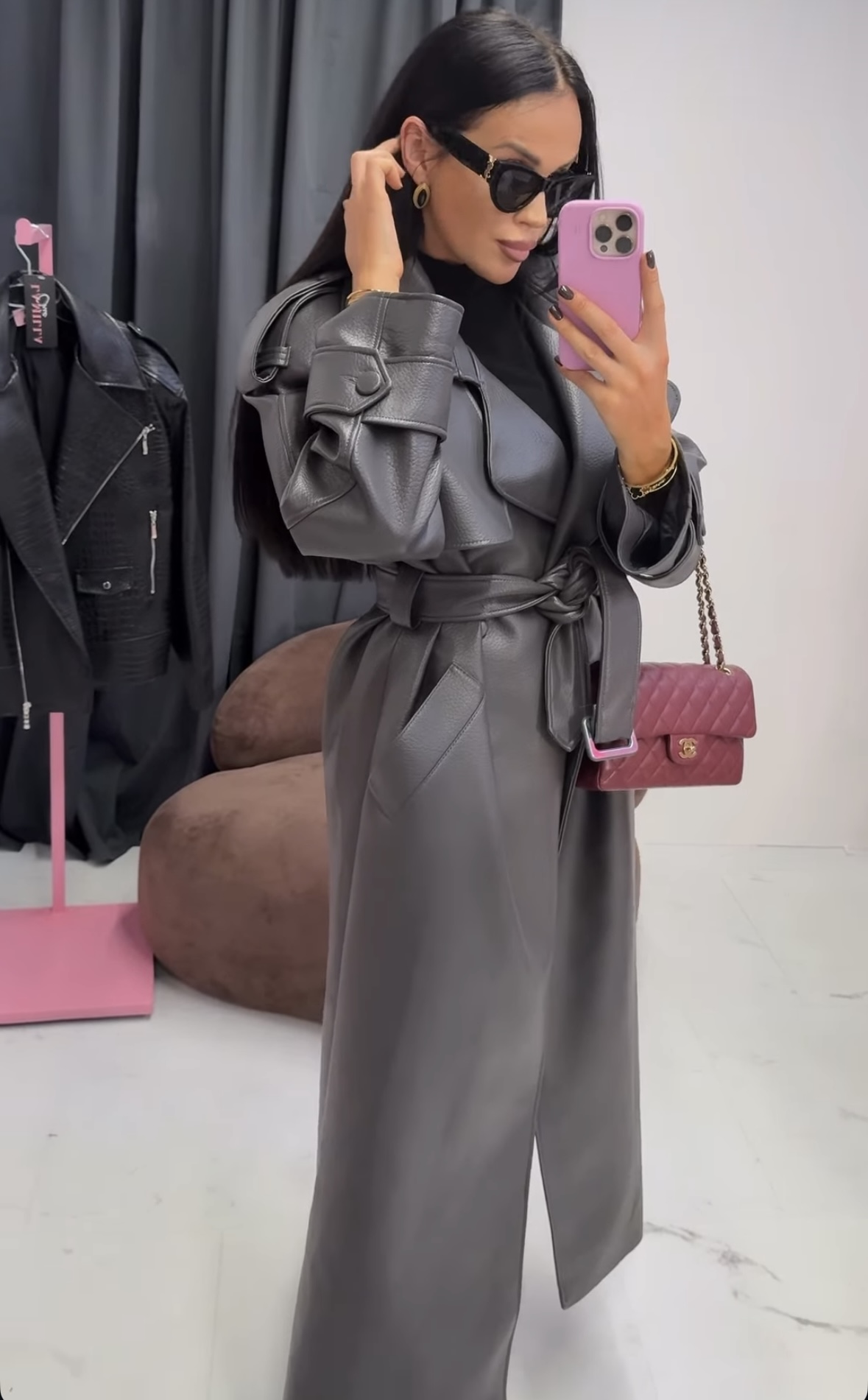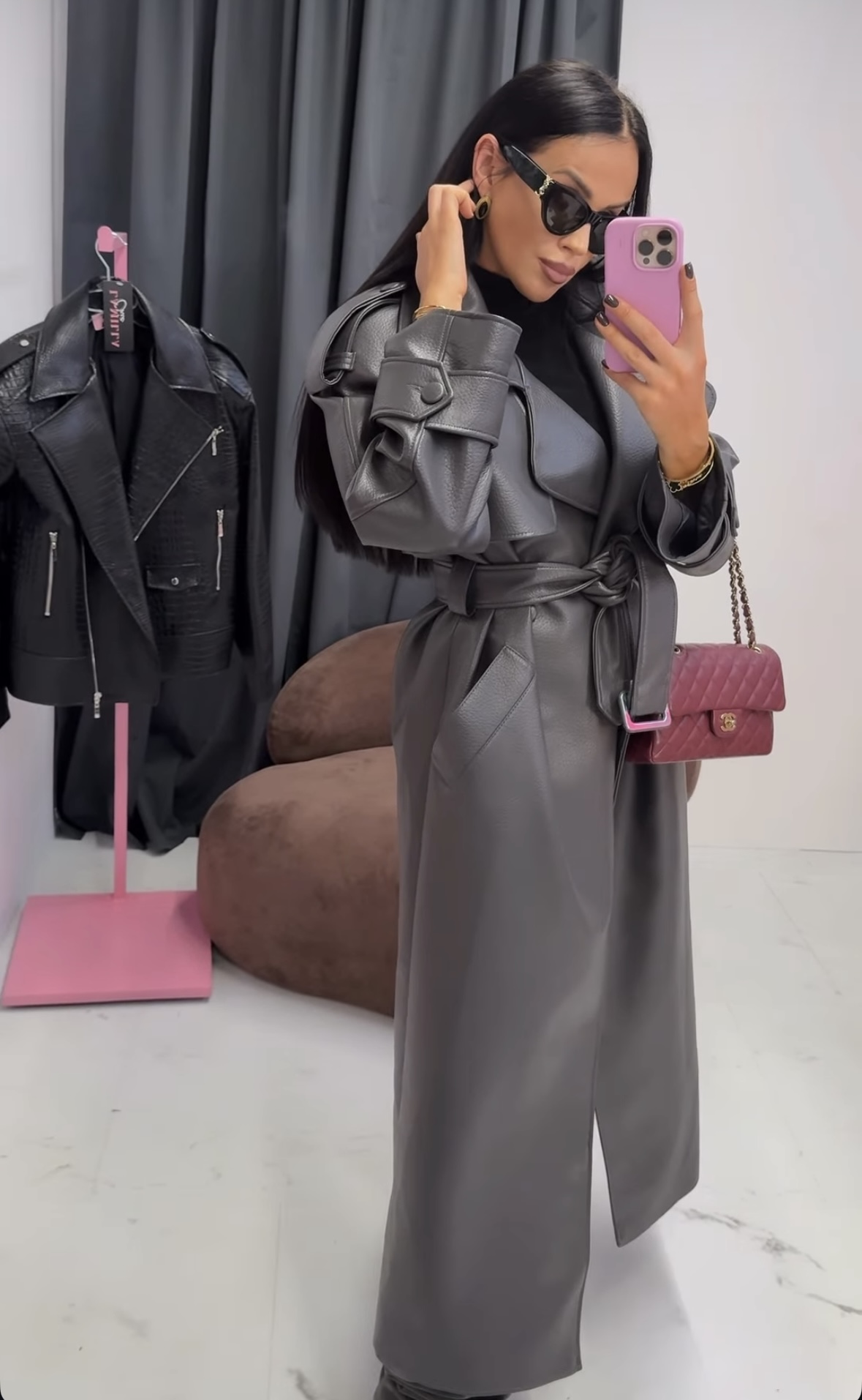 Płaszcz długi eko skóra z paskiem La Milla – grafitowy