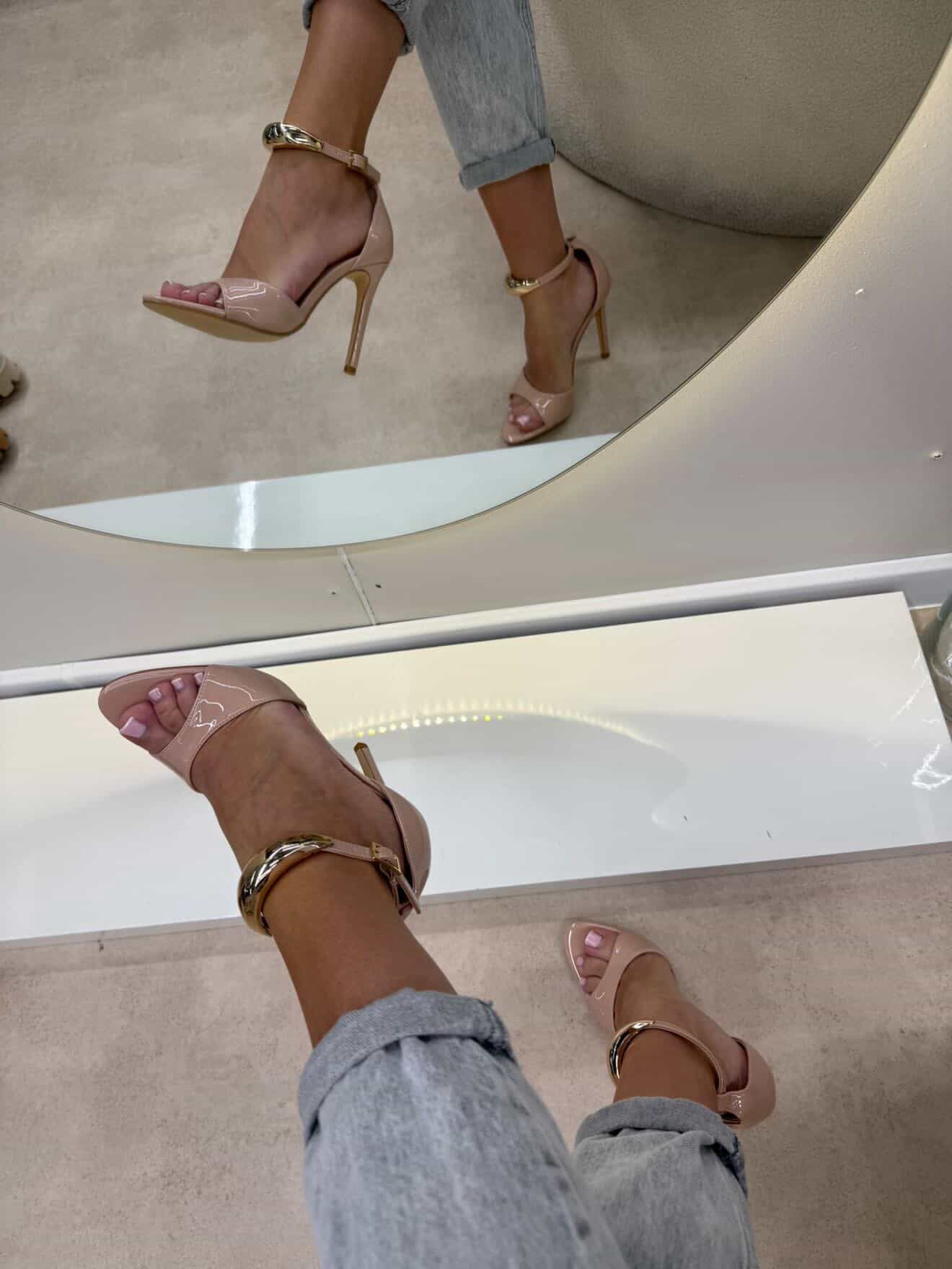 Minimalistyczny przód z szerokim paskiem stabilnie podtrzymuje stopę, natomiast regulowany pasek wokół kostki z ozdobnym, złotym detalem dodaje całości wyrafinowanego akcentu. Smukły obcas o wysokości 11 cm spektakularnie wydłuża nogi i modeluje sylwetkę.