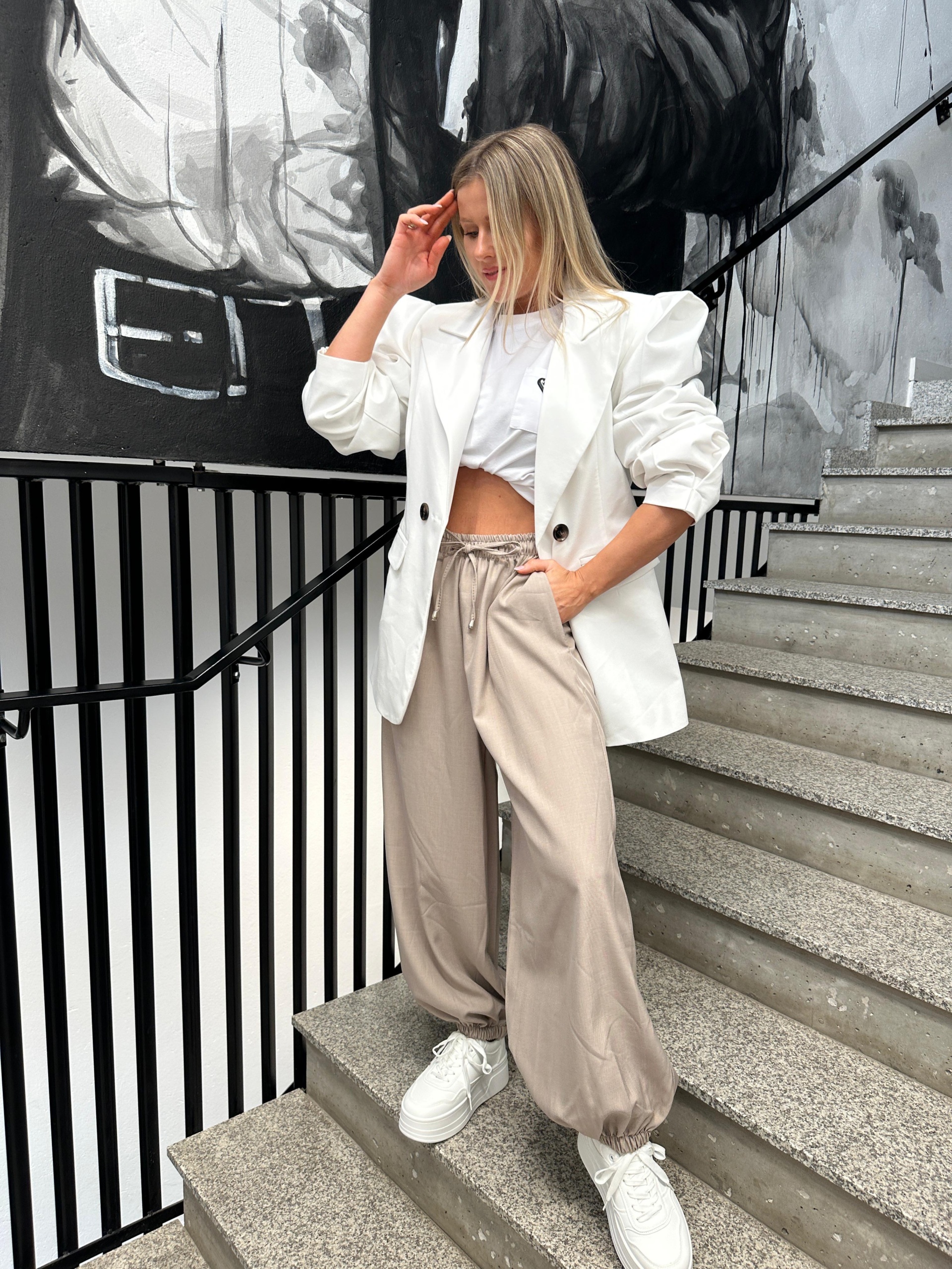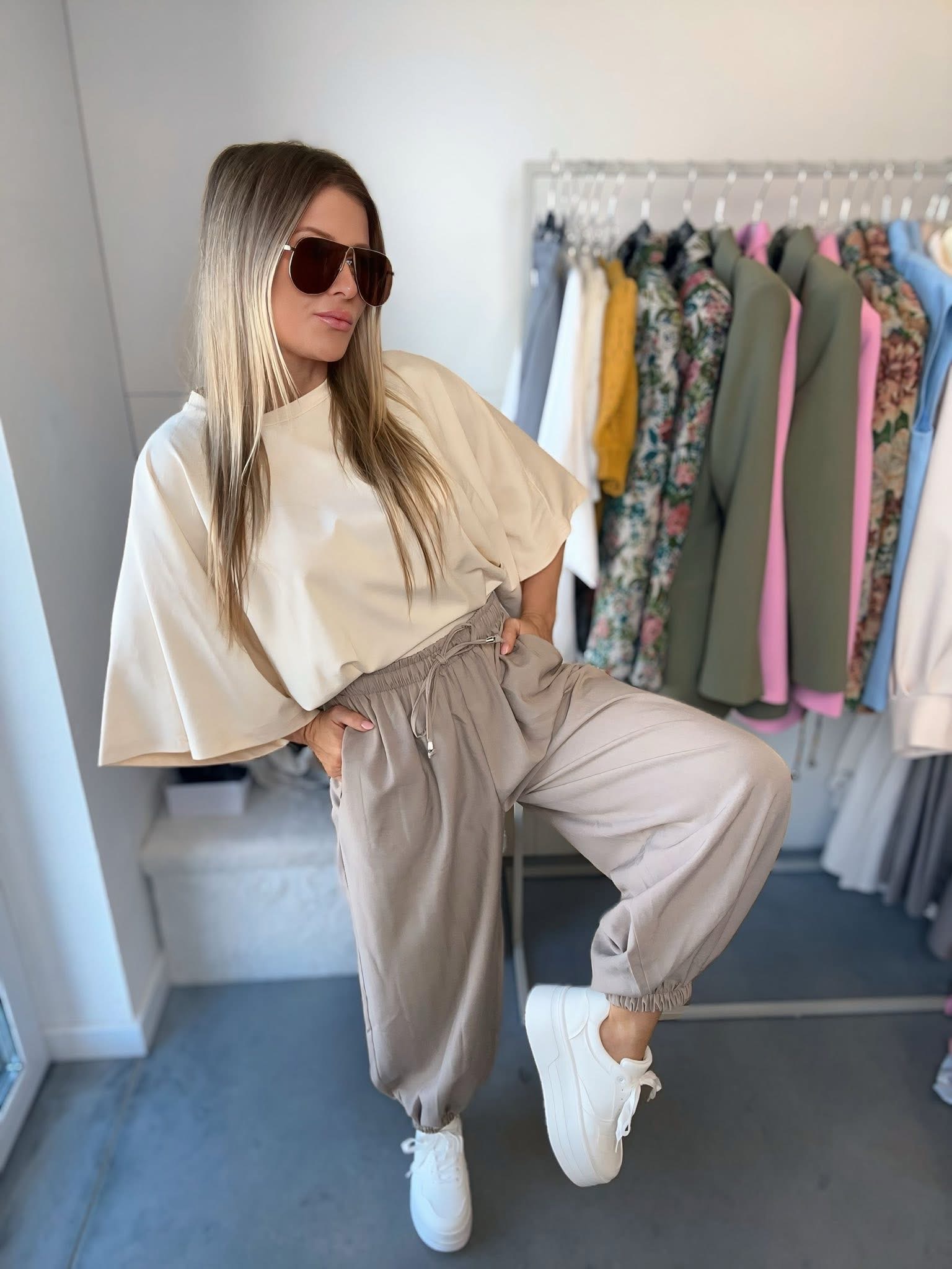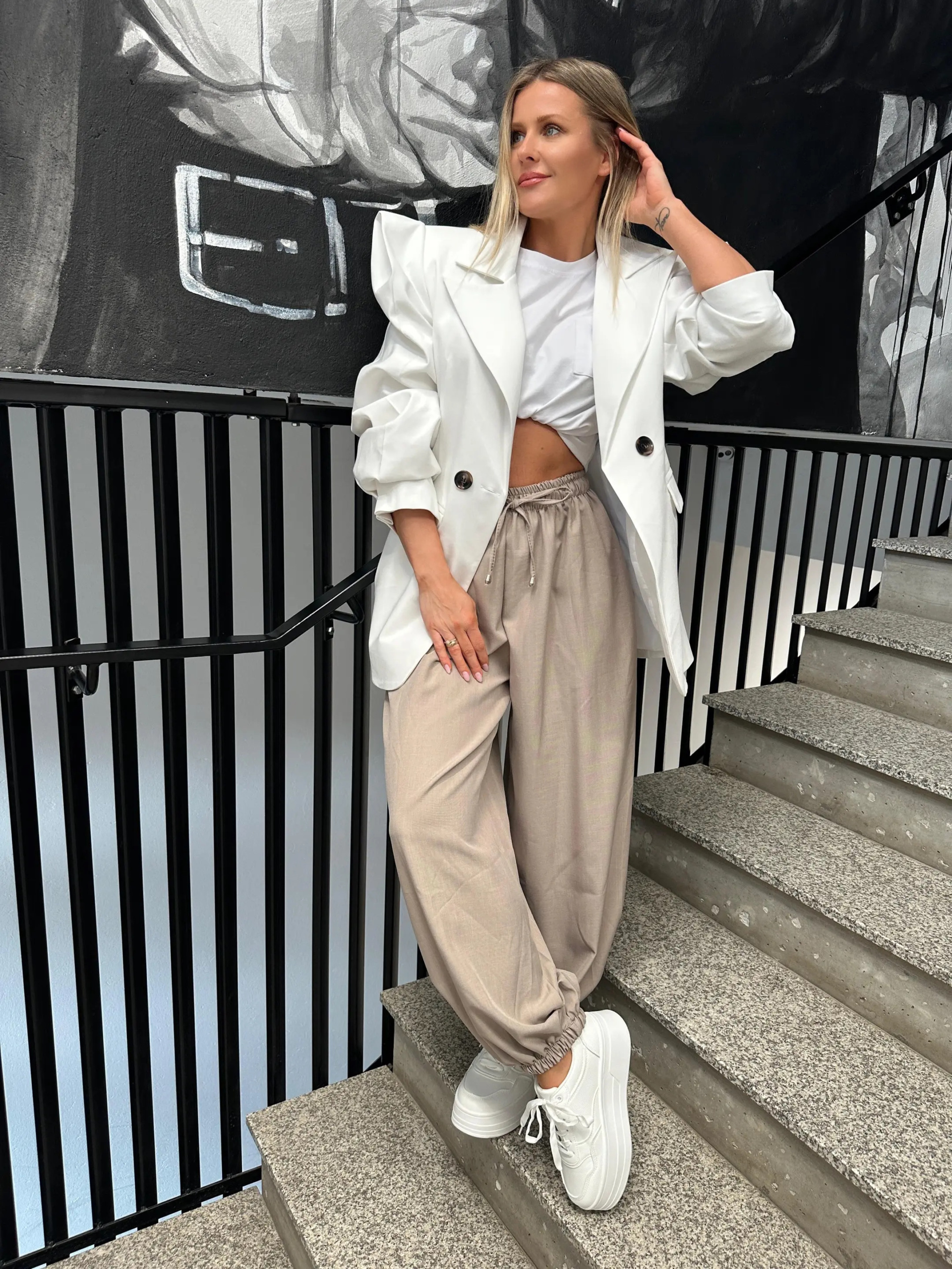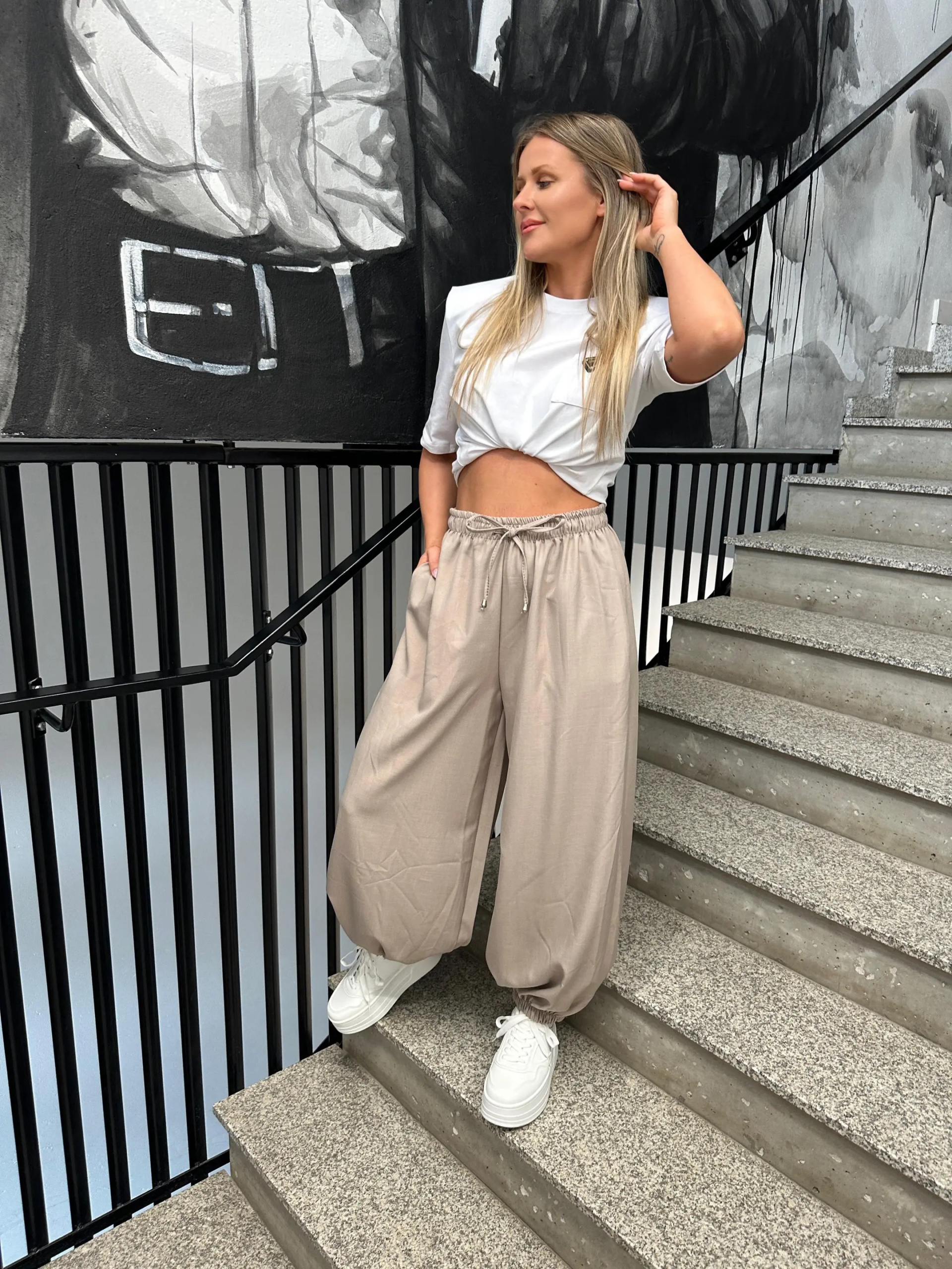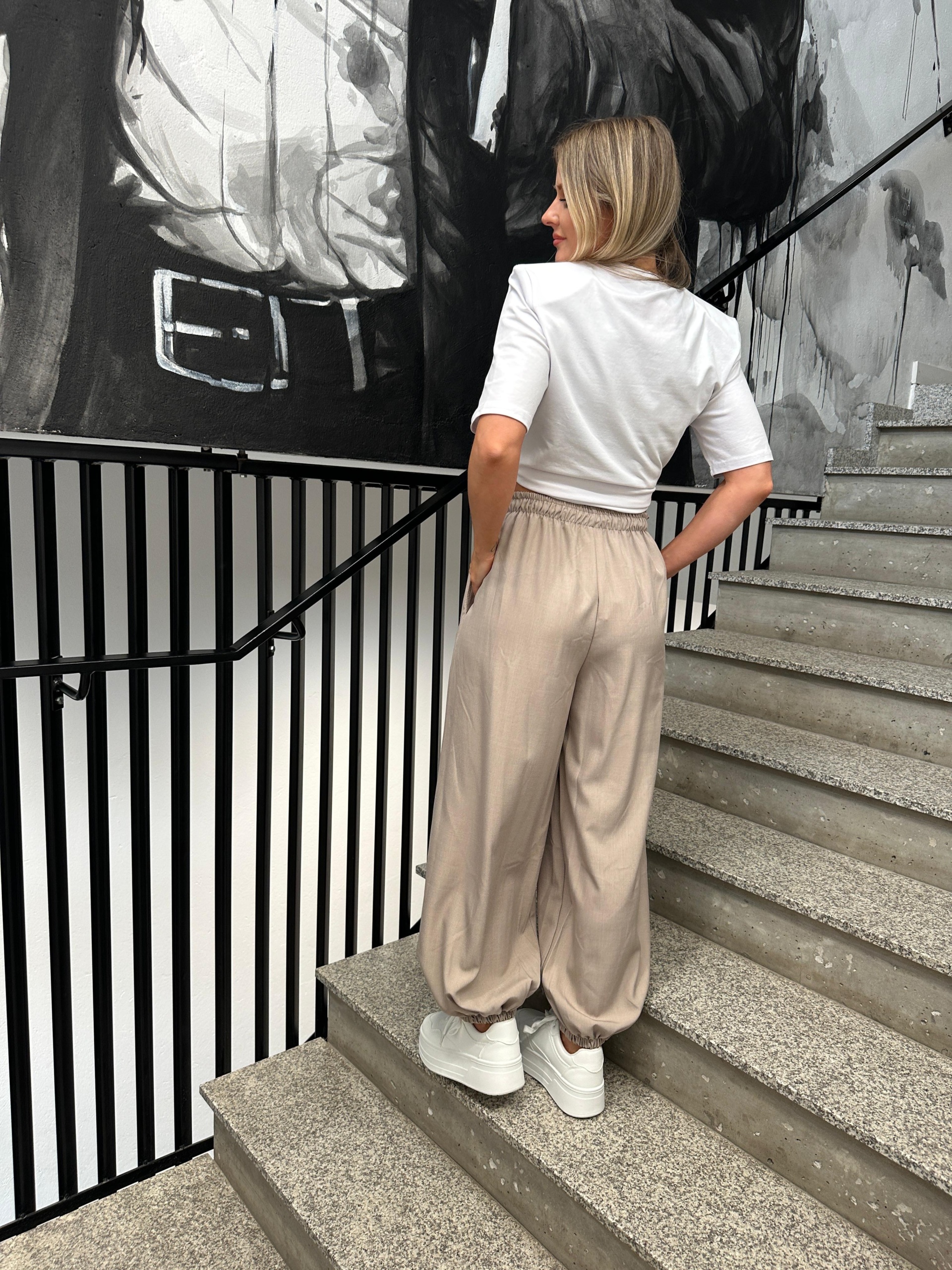 Wykonane z lekkiego, przyjemnego w dotyku materiału, który pięknie się układa i zapewnia komfort noszenia przez cały dzień. Elastyczna gumka w pasie sprawia, że spodnie doskonale dopasowują się do sylwetki, a dodatkowe wiązanie w talii podkreśla ich sportowo-elegancki charakter.