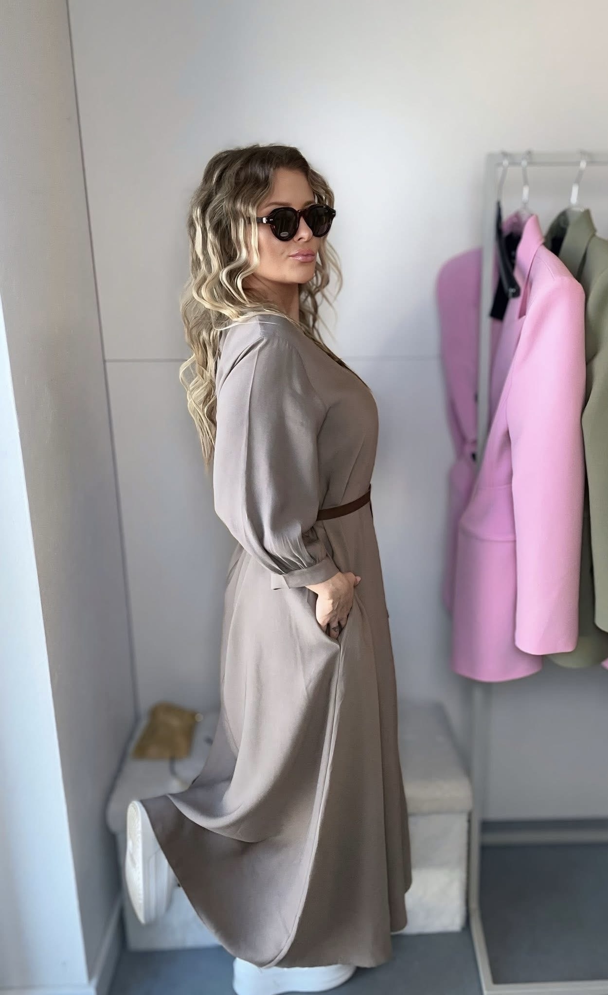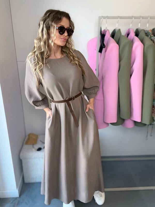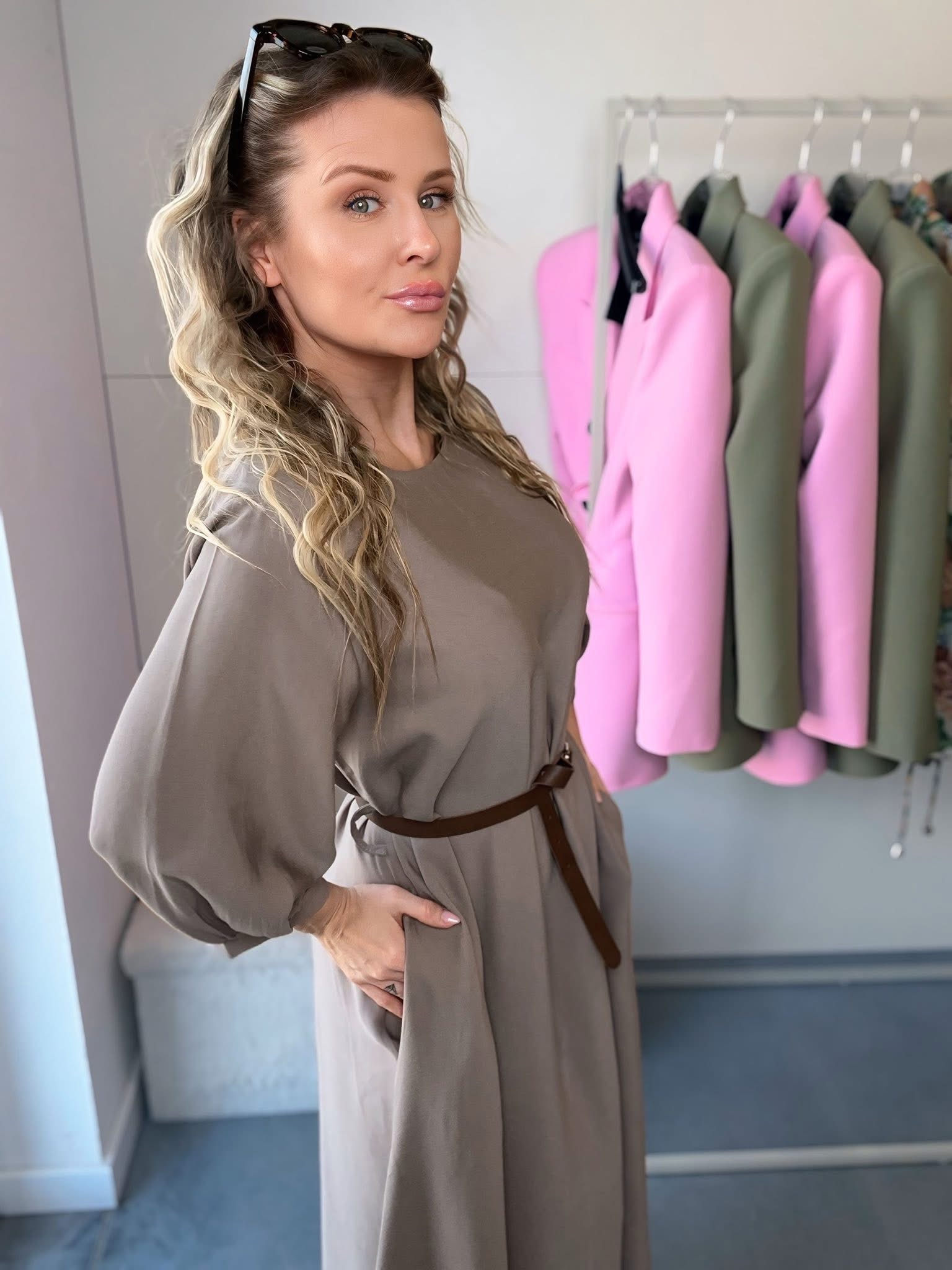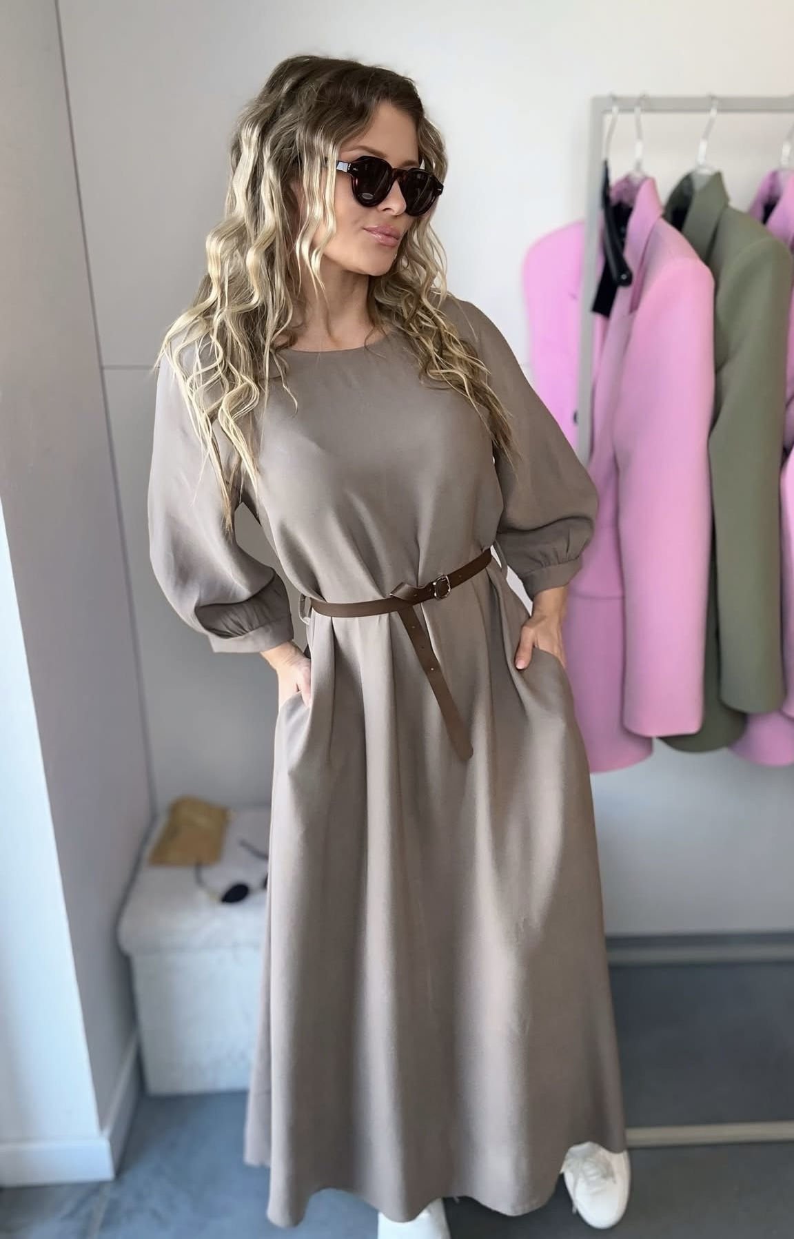 W zestawie znajduje się pasek, który pięknie podkreśla talię i pozwala dopasować fason do sylwetki. Dzięki temu sukienka wygląda niezwykle kobieco i stylowo.