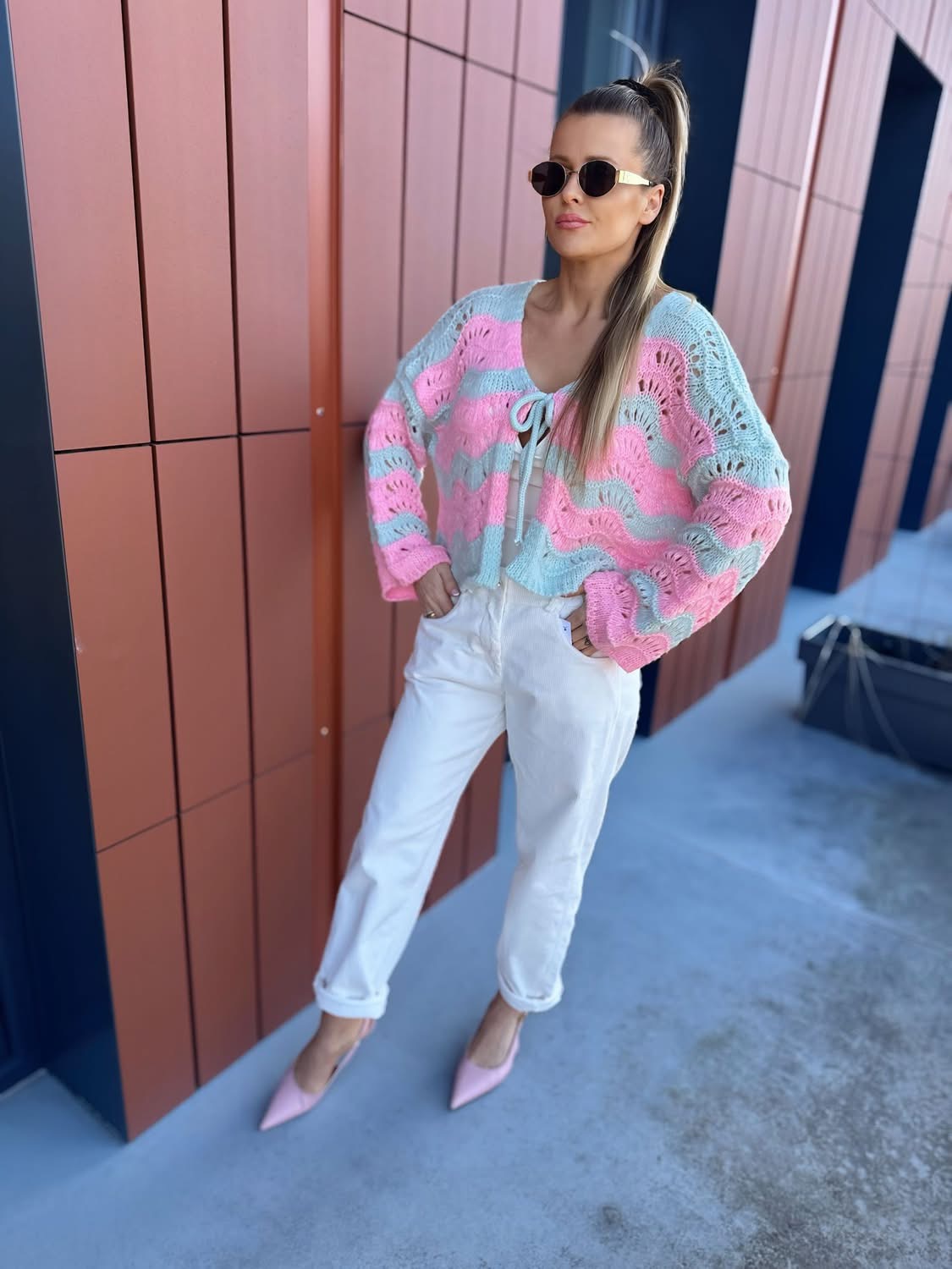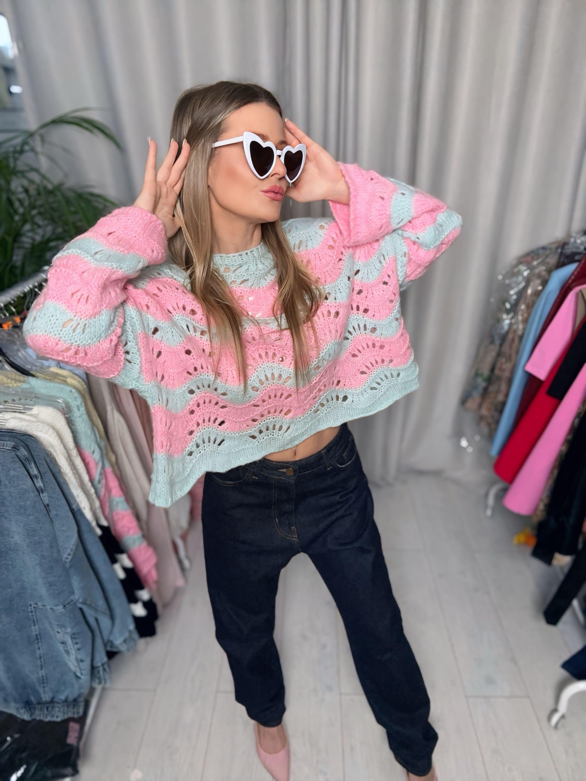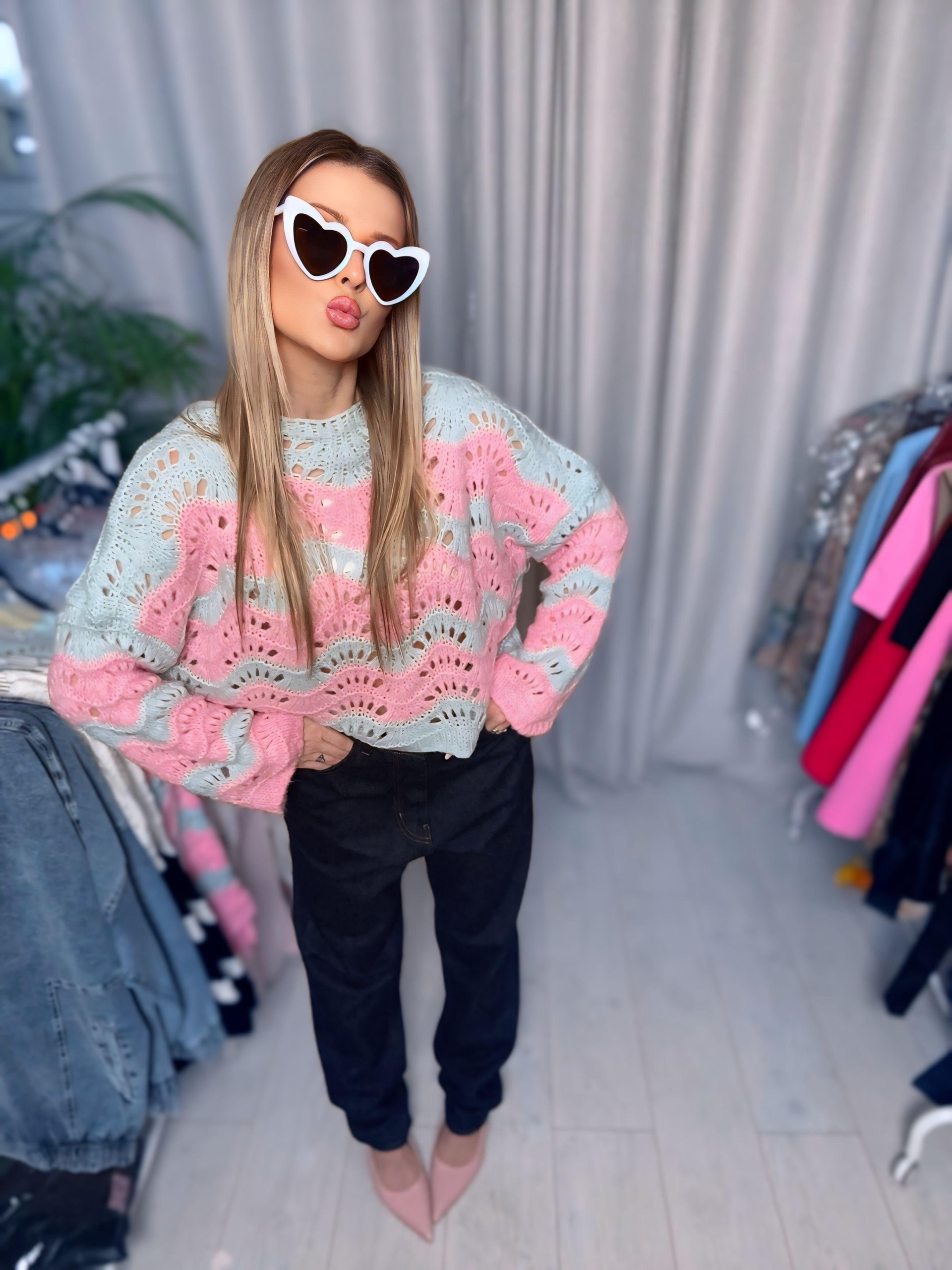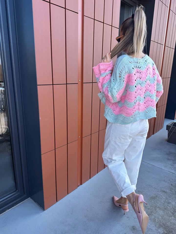Sweter ażurowy | Klara | różowo-turkusowy