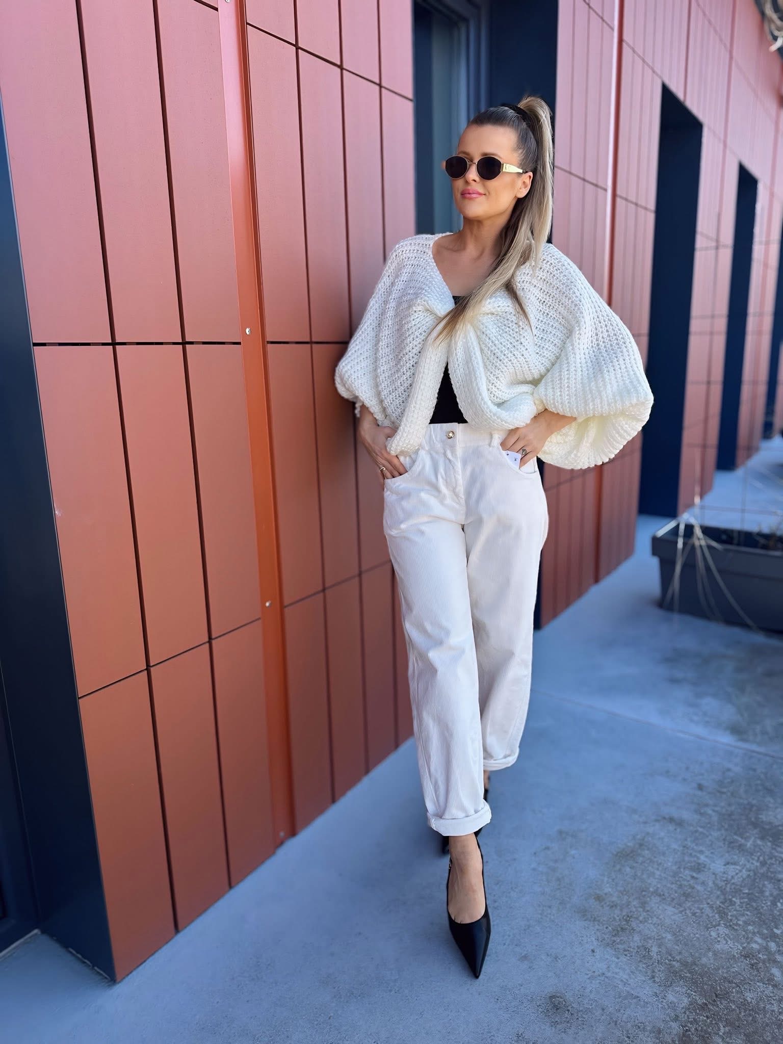 Największym atutem jest spektakularne wycięcie na plecach zakończone dekoracyjną kokardą. Ten detal nadaje całości kobiecego charakteru i sprawia, że sweter prezentuje się zjawiskowo zarówno w codziennych stylizacjach, jak i w bardziej eleganckim wydaniu.