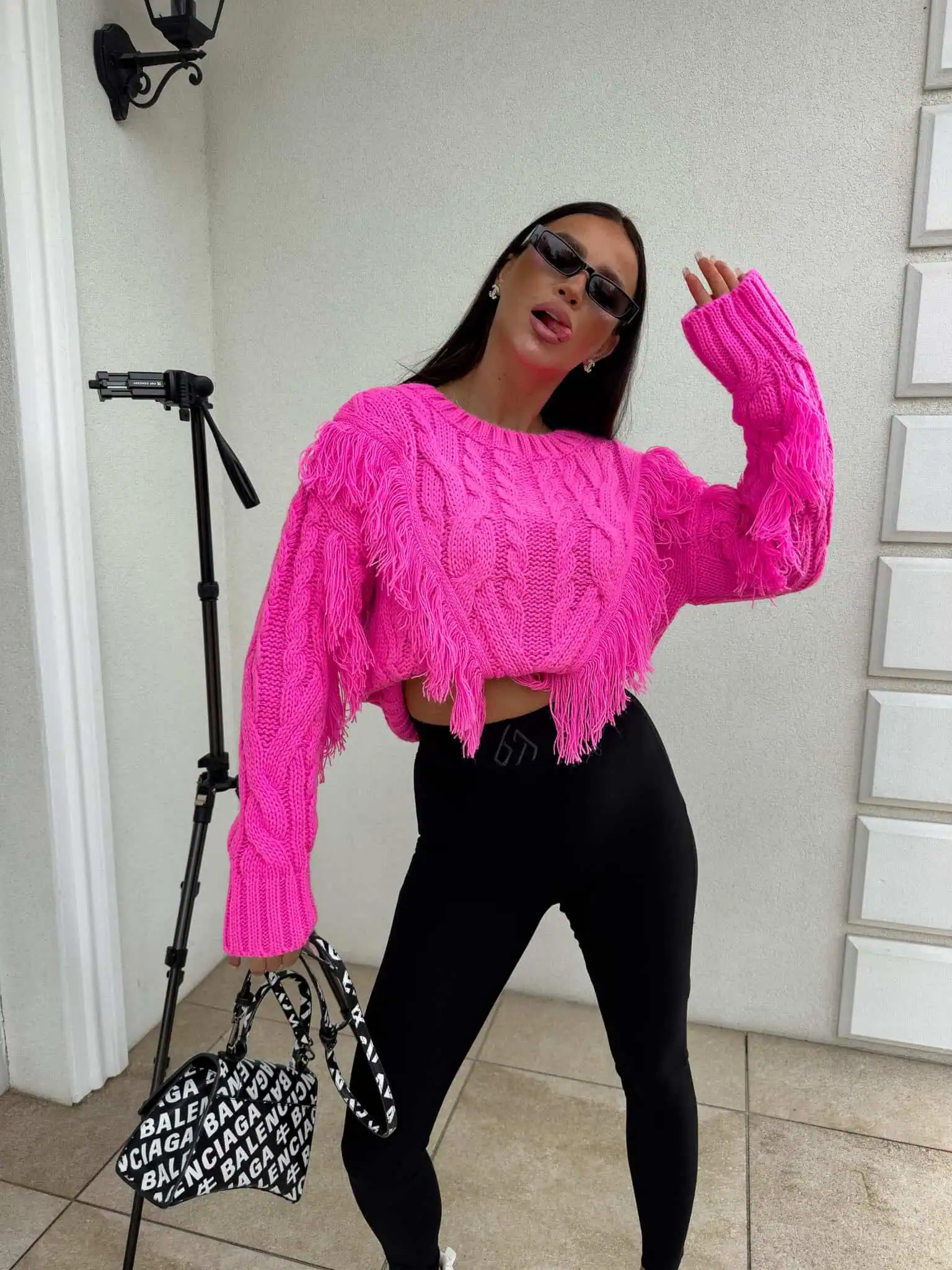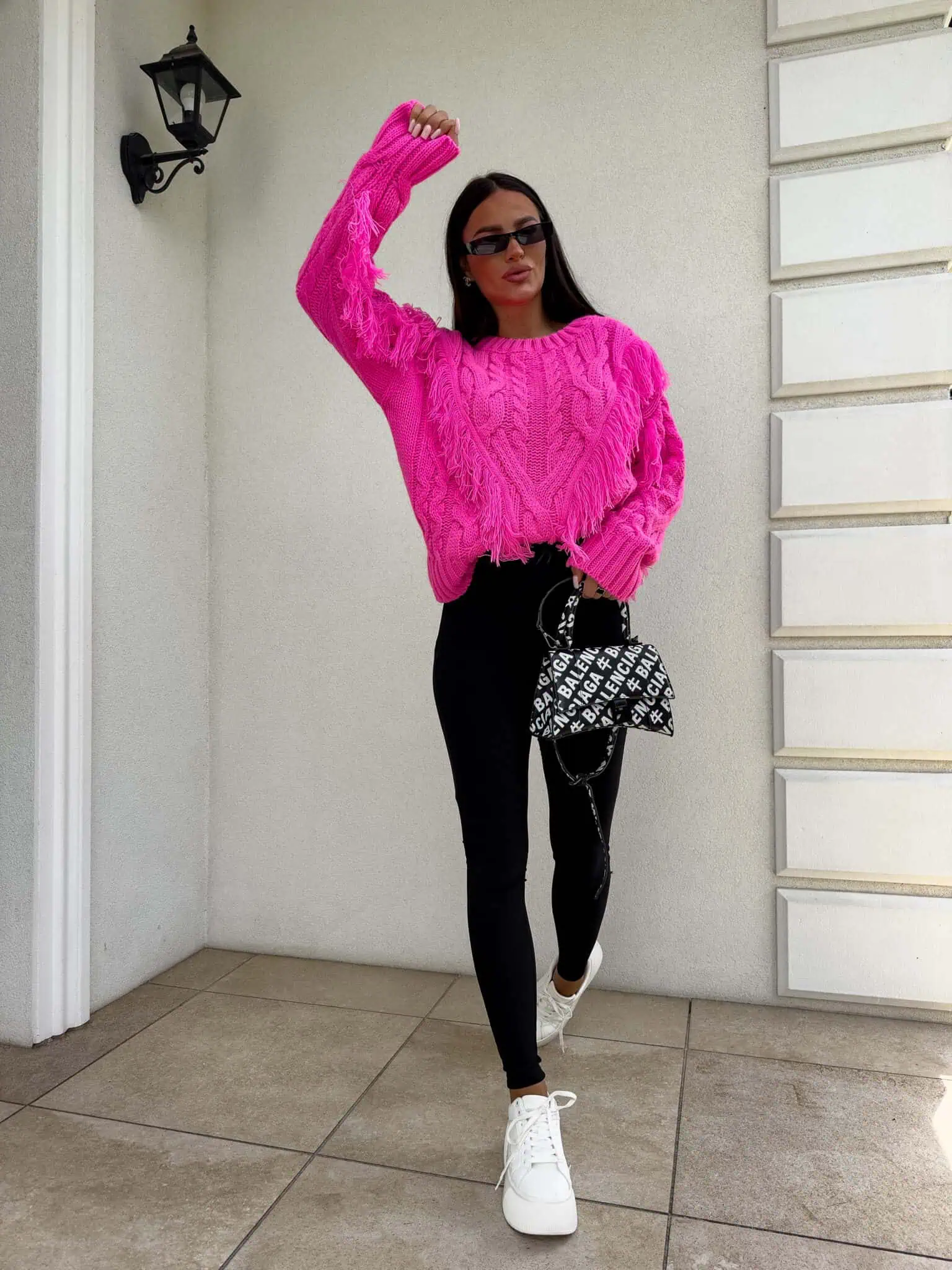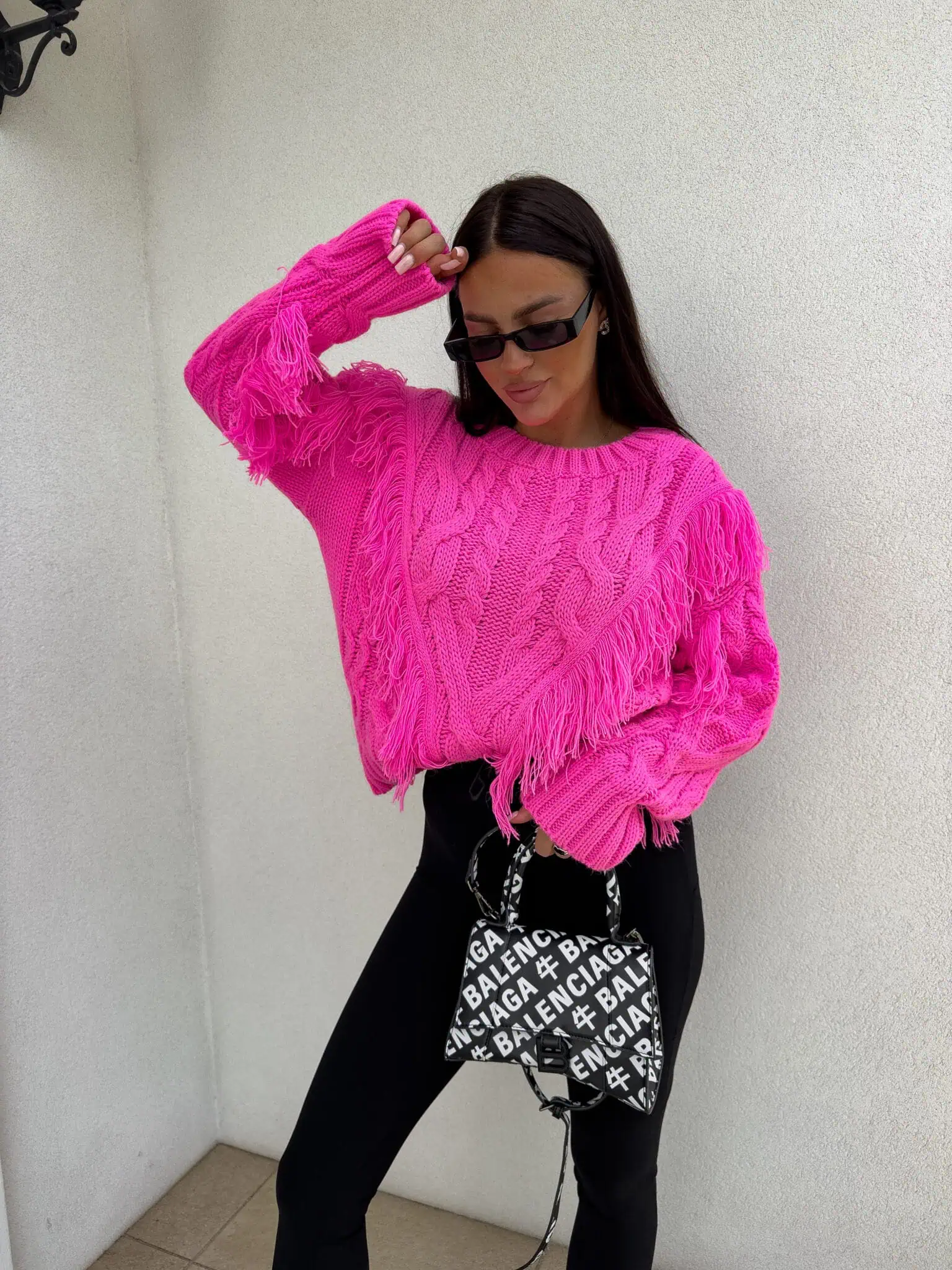 Stylowy sweter o luźnym, oversize’owym kroju, wykonany z miękkiego, plecionego materiału z wyraźnym wzorem warkoczy. Jego wyjątkowy design podkreślają ozdobne frędzle, które dodają całości oryginalnego charakteru i nawiązują do stylu boho. Długie rękawy zapewniają komfort noszenia i świetnie sprawdzają się w chłodniejsze dni.