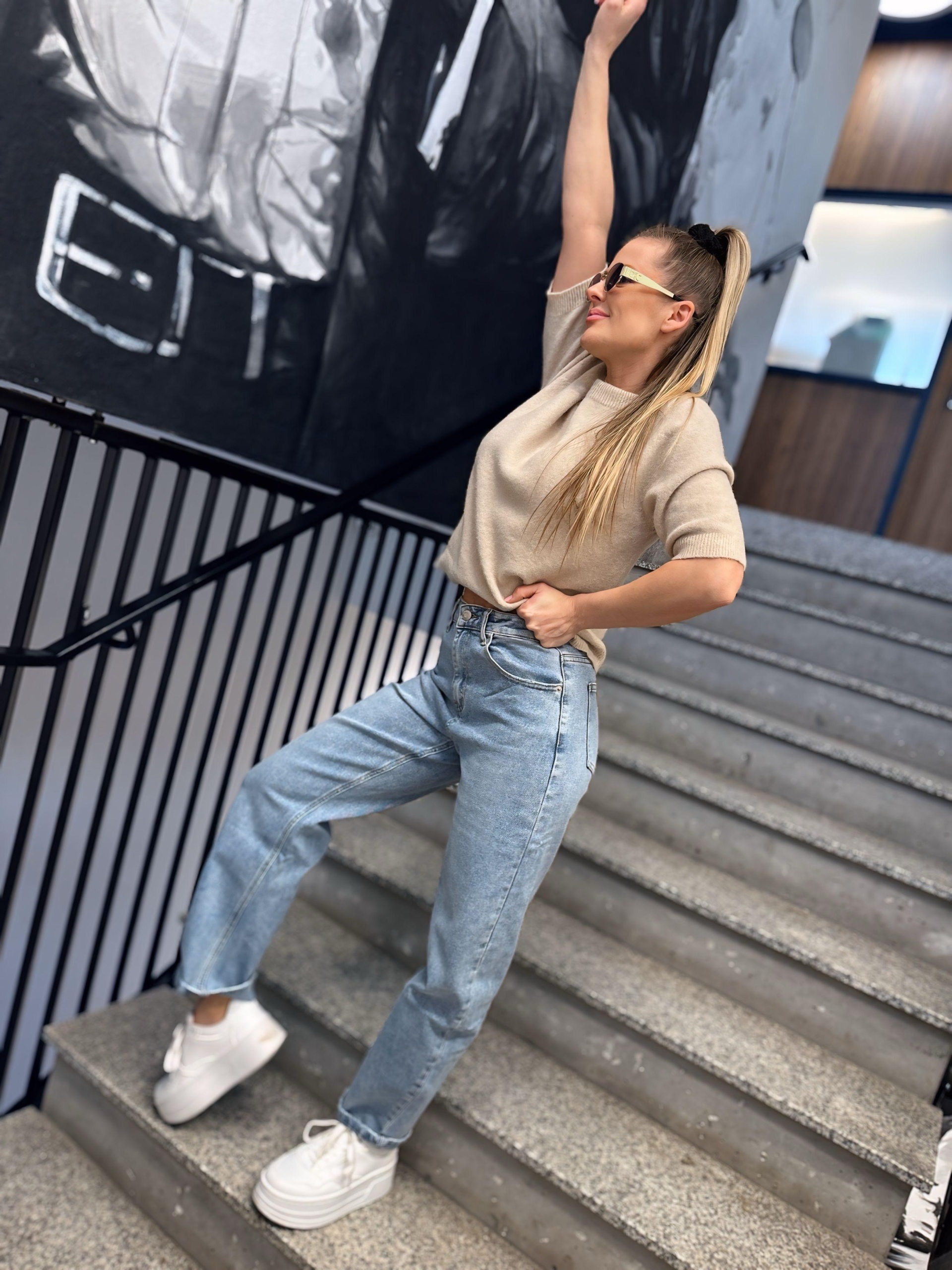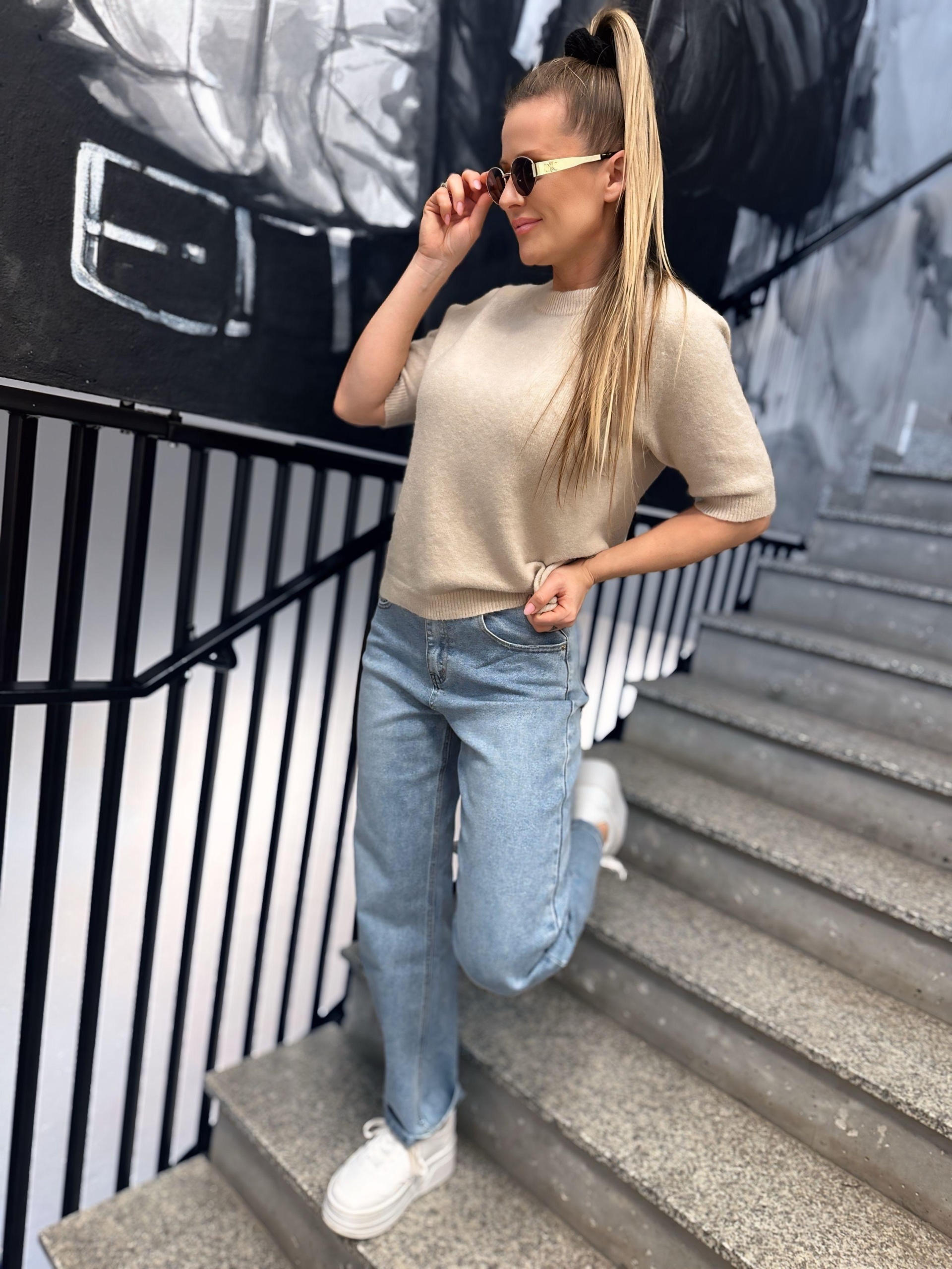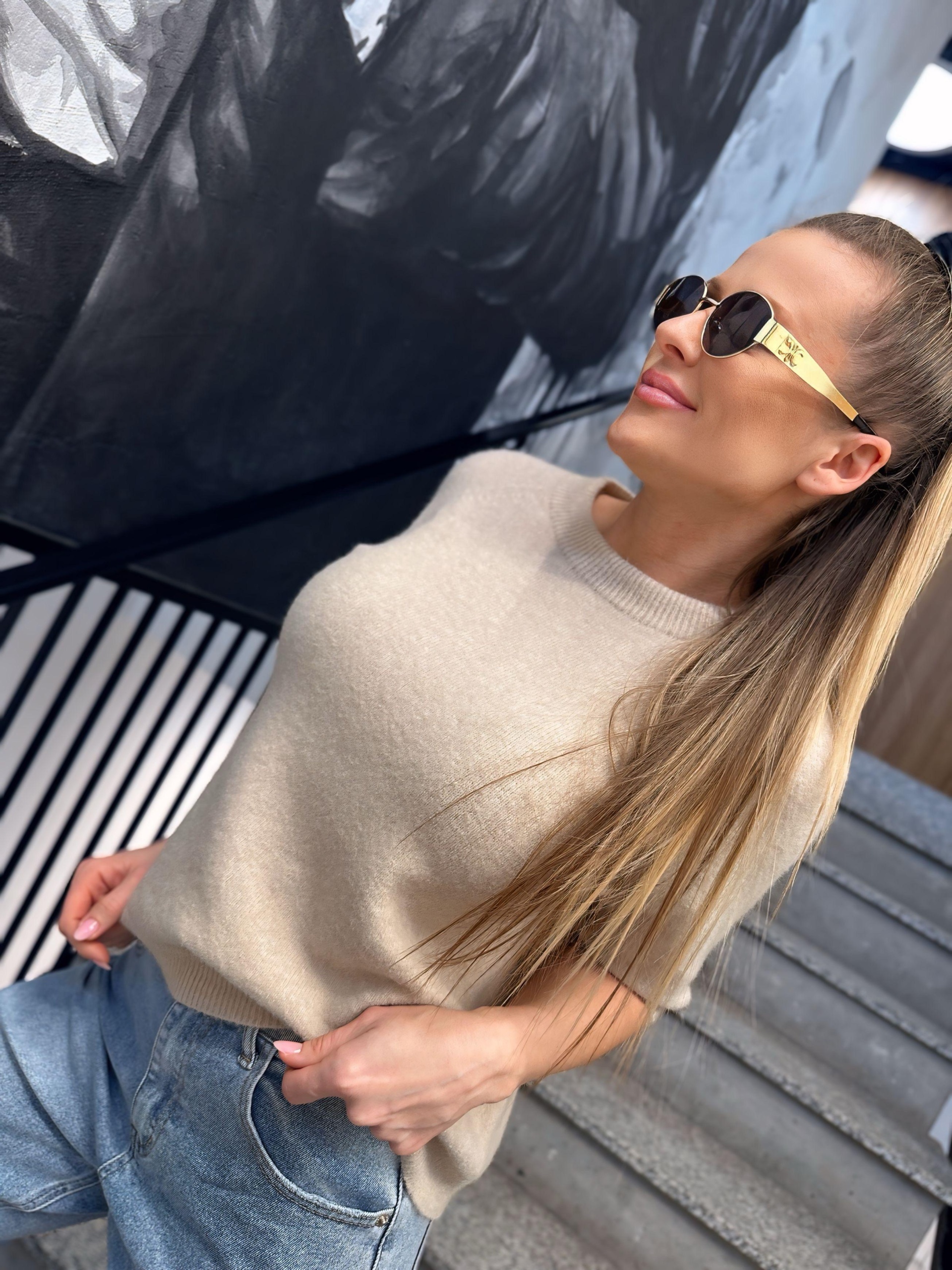 Model został wykonany z wysokiej jakości mieszanki z dodatkiem baby alpaki, dzięki czemu jest wyjątkowo przyjemny w dotyku, lekki, a jednocześnie ciepły. Klasyczny krój z krótkim rękawem i subtelnym półokrągłym dekoltem sprawia, że sweter pięknie układa się na sylwetce i pasuje do spodni, spódnic czy marynarek.
