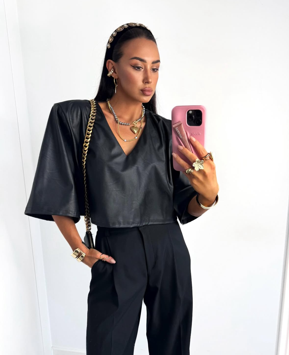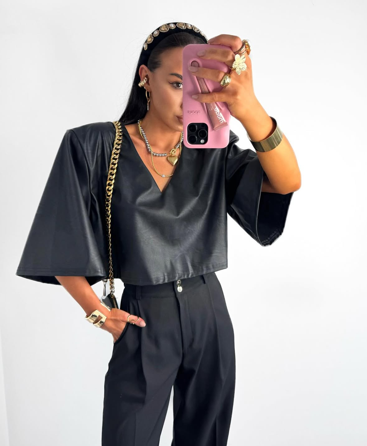 Krótki T-shirt z eco skóry marki LaMilla to propozycja dla kobiet, które lubią wyróżniać się stylowym minimalizmem. Fantastyczny krój oversize, co powoduje że będzie pasowała do obcisłej spódniczki lub jeansów.